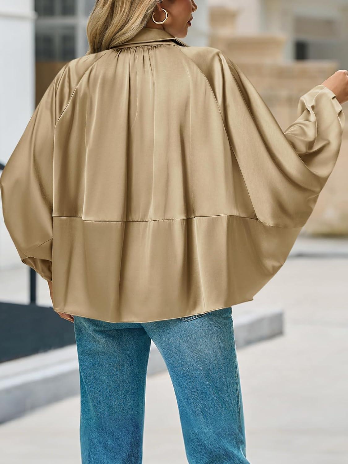 Tankaneo Womens Bomber Jackets Oversized Batwing Sleeve Zip Up Puffed Jacket Lapel Collar Pleated Outerwear(Khaki)