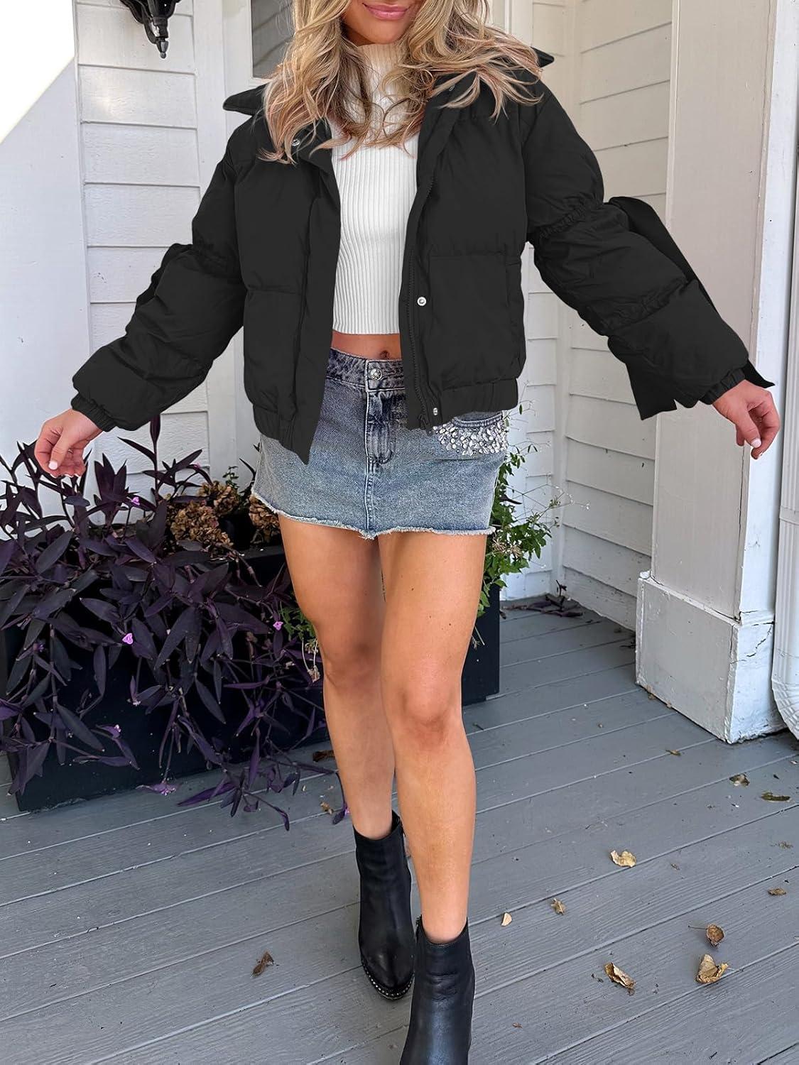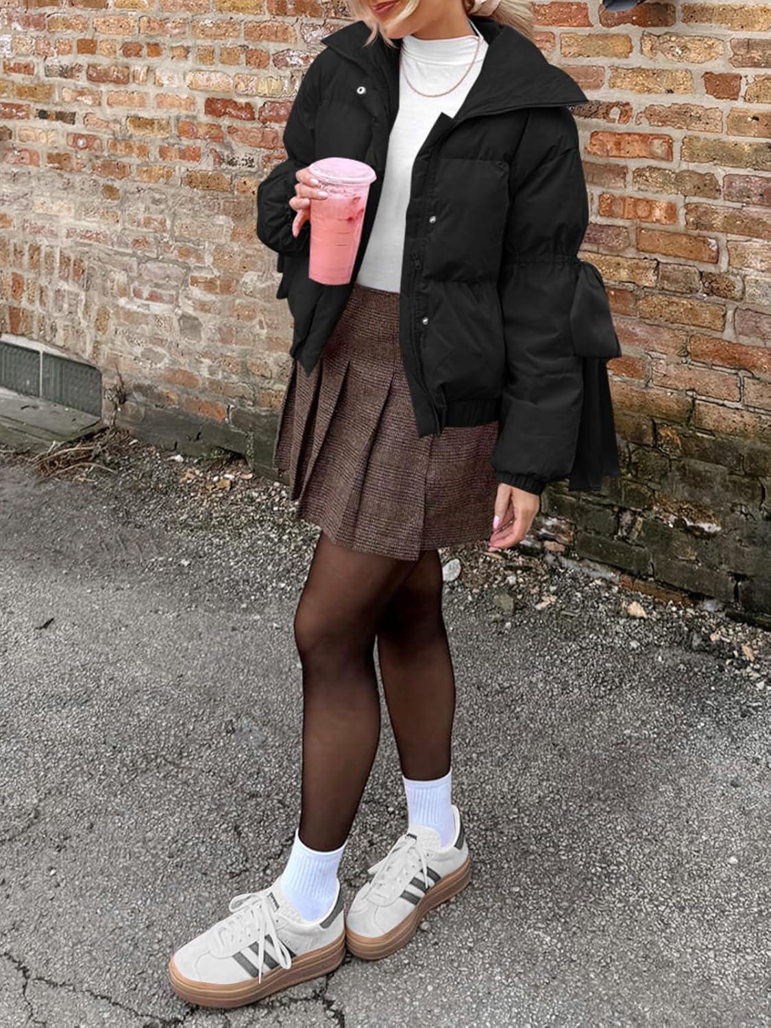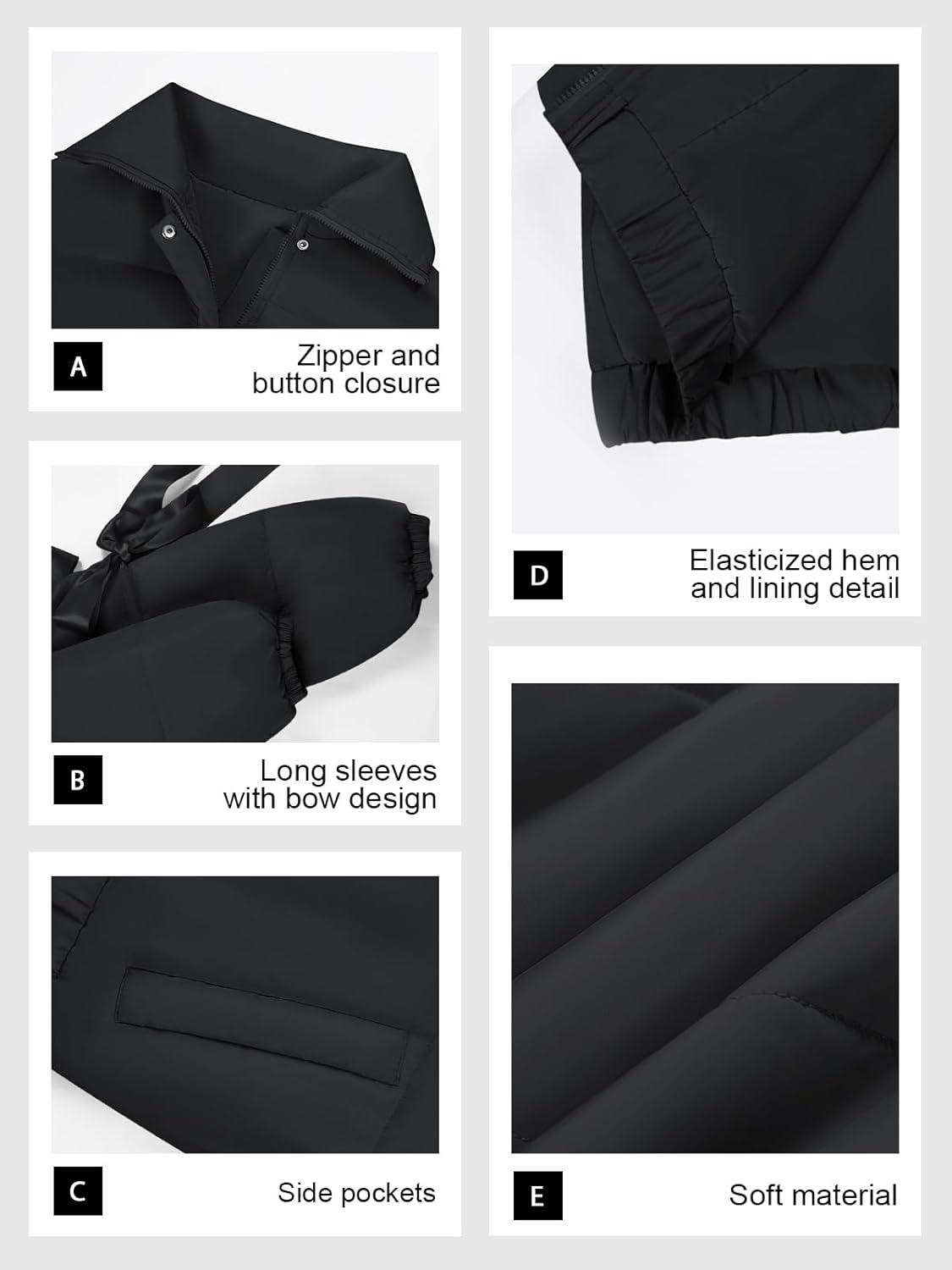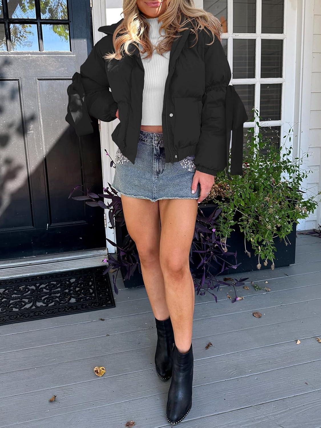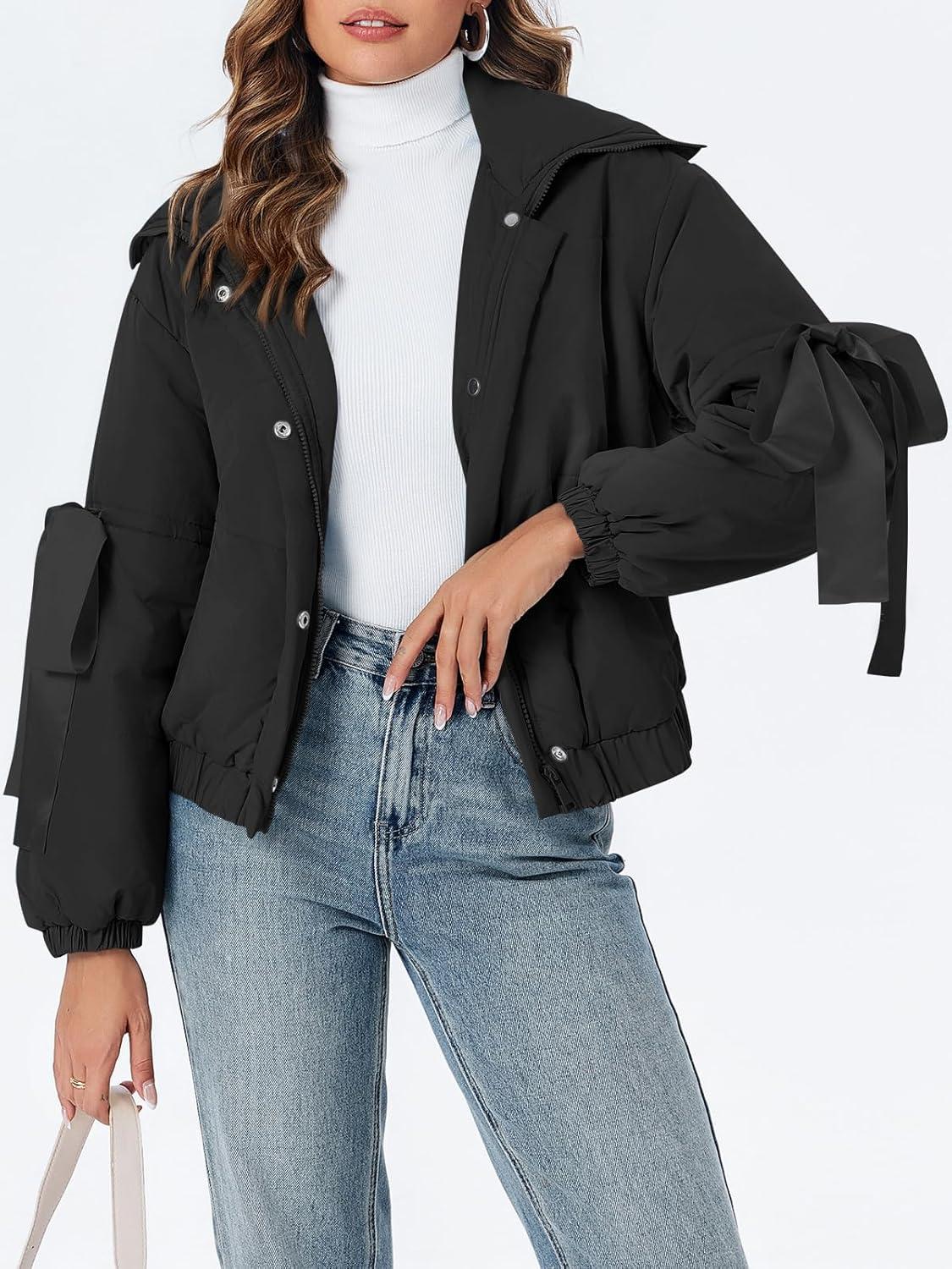 Tankaneo Womens Bow Puffer Jacket Winter Warm Cropped Quilted Jackets Baggy Short Down Coats(Black)