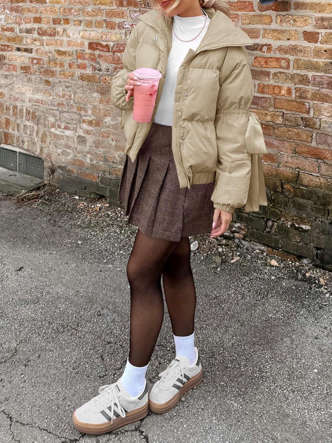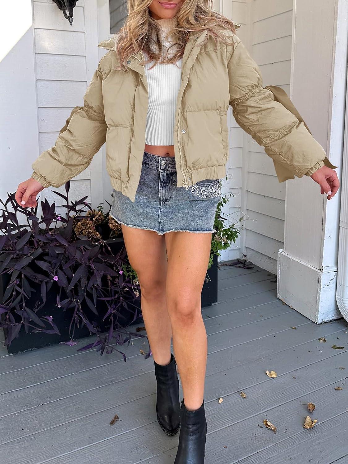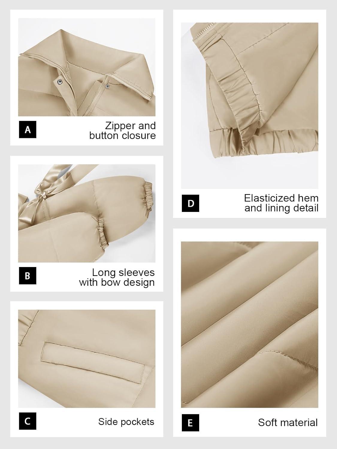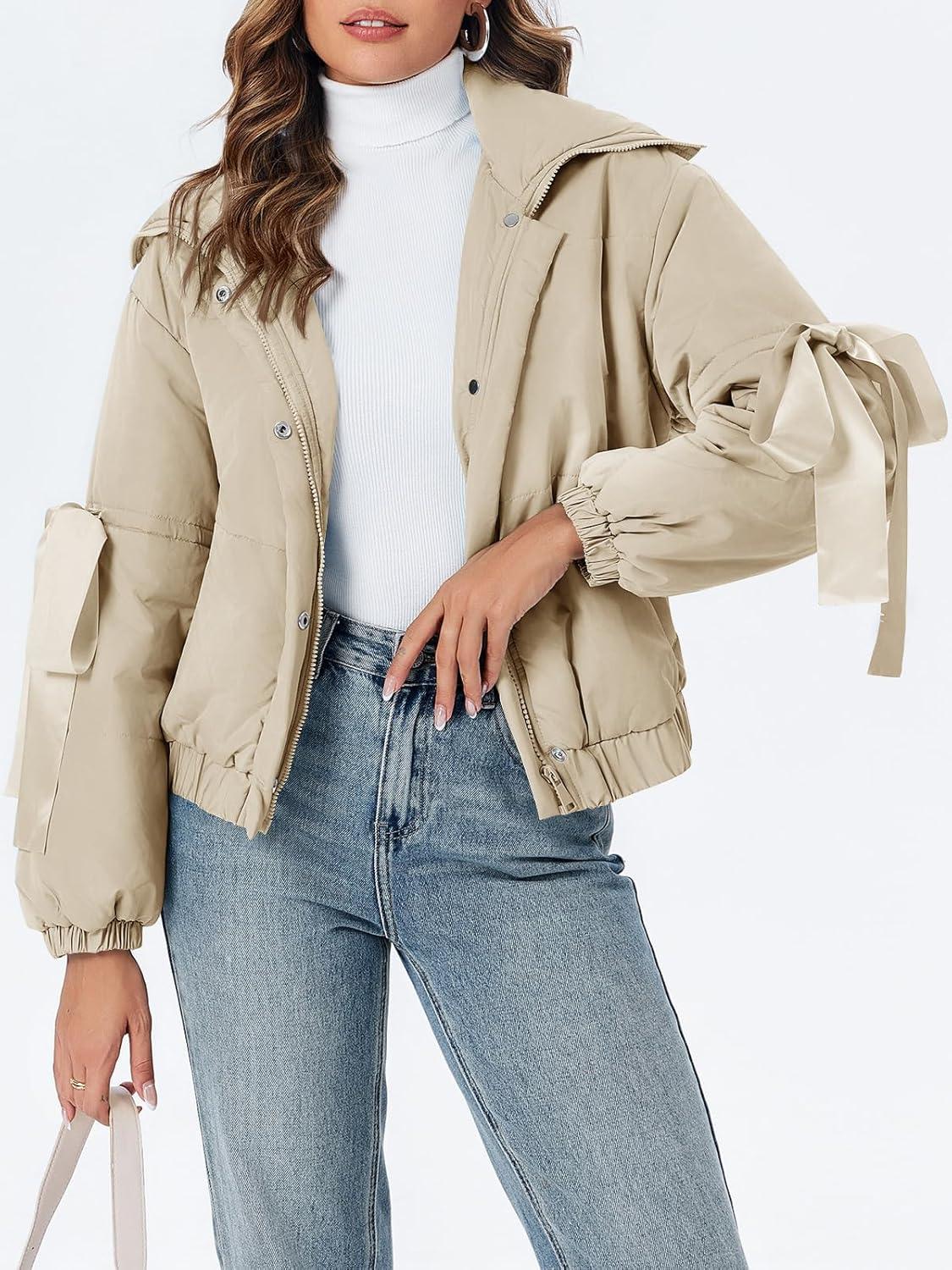 Tankaneo Womens Bow Puffer Jacket Winter Warm Cropped Quilted Jackets Baggy Short Down Coats(Light Khaki)