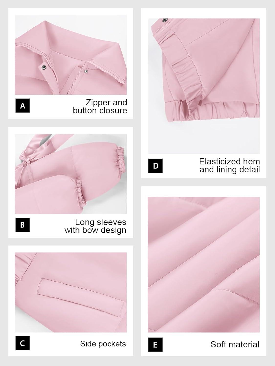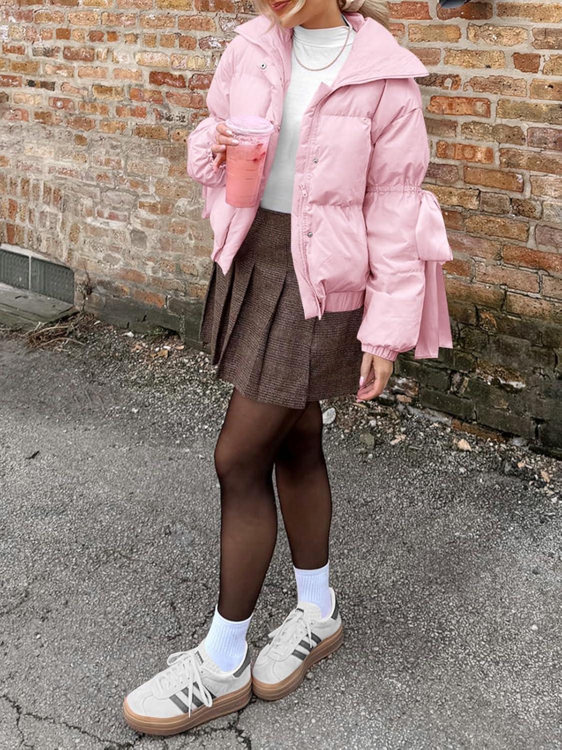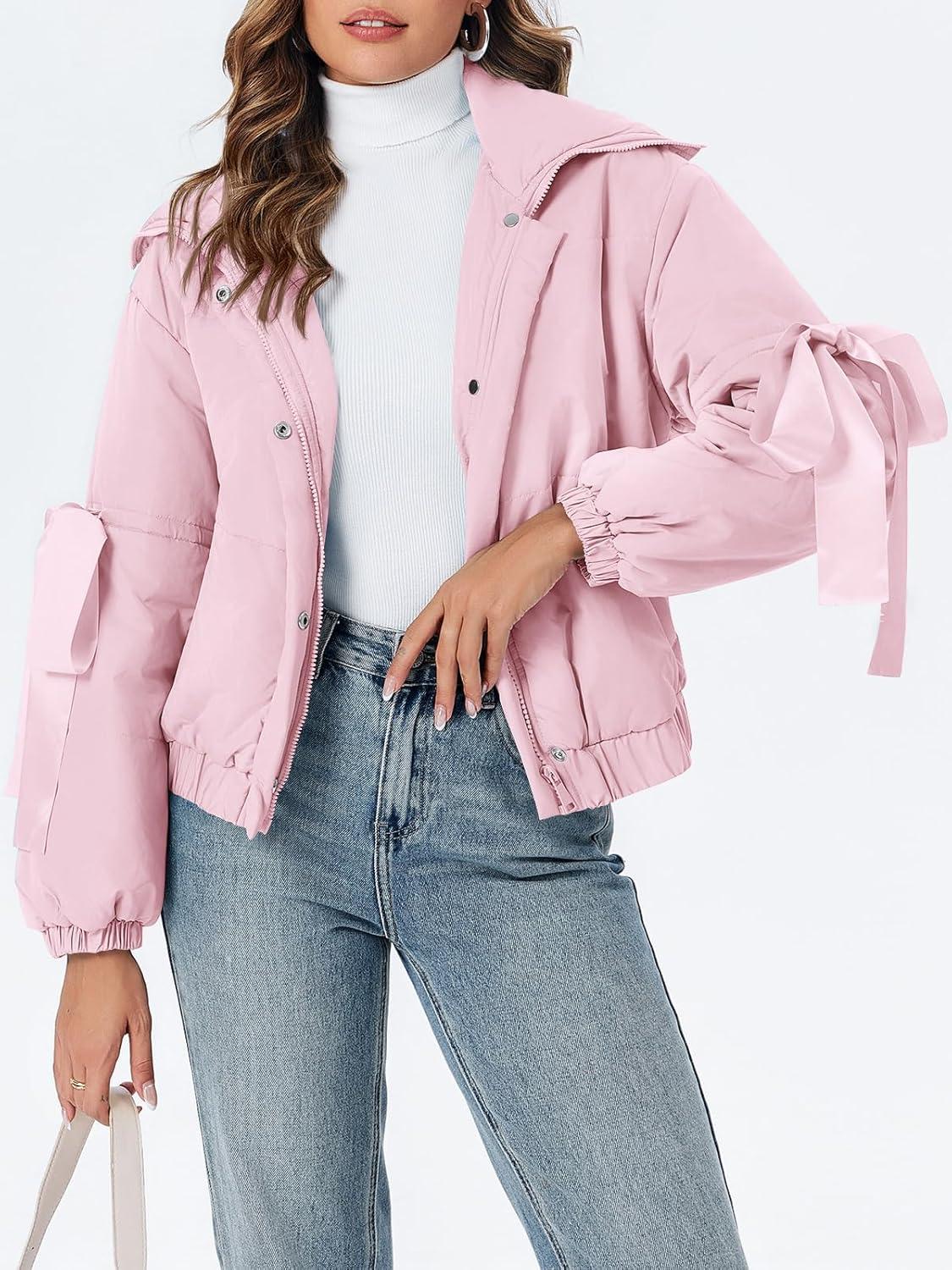 Tankaneo Womens Bow Puffer Jacket Winter Warm Cropped Quilted Jackets Baggy Short Down Coats(Pink)