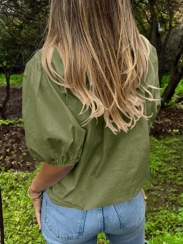 Tankaneo Women’s Button Down Shirts Short Puff Sleeve Collared Dressy Casual Blouse Tops(Army Green)