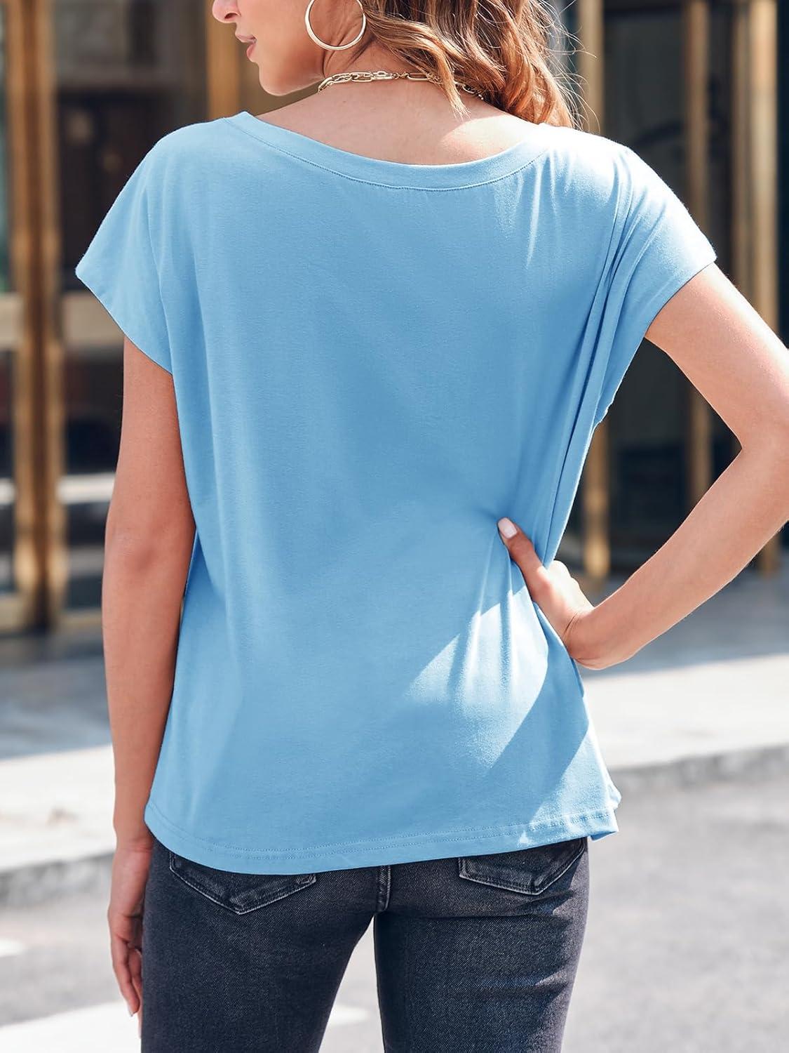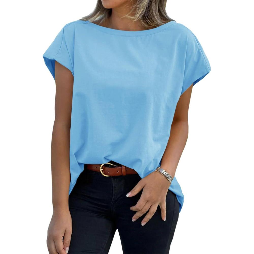 Tankaneo Womens Cap Sleeve Tops Boat Neck T-Shirts Summer Casual Loose Fit Basic Tees(Blue)