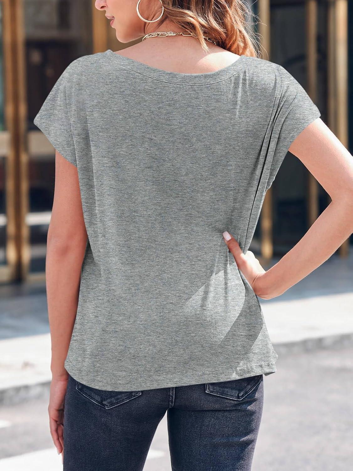 Tankaneo Womens Cap Sleeve Tops Boat Neck T-Shirts Summer Casual Loose Fit Basic Tees(Grey)