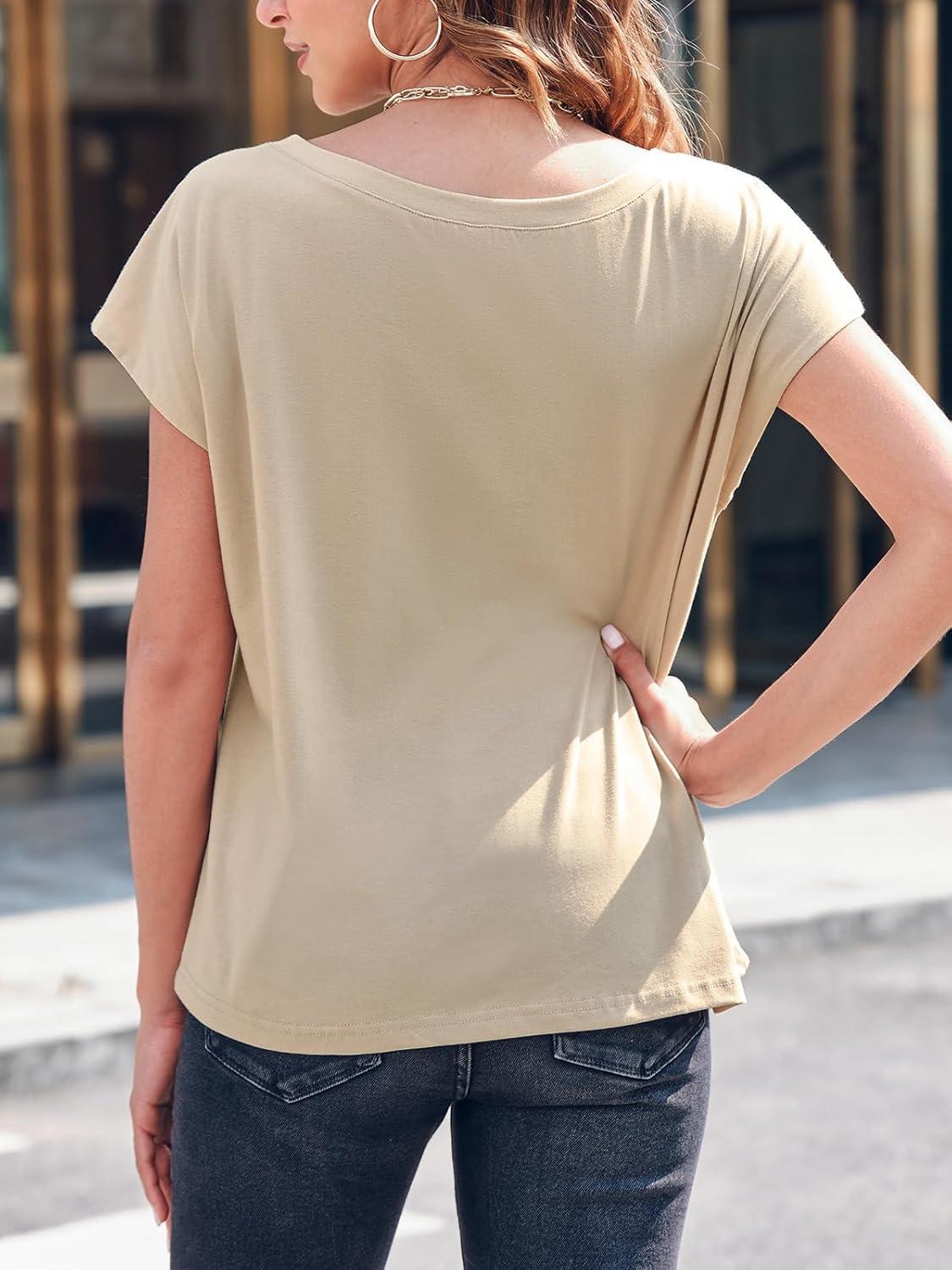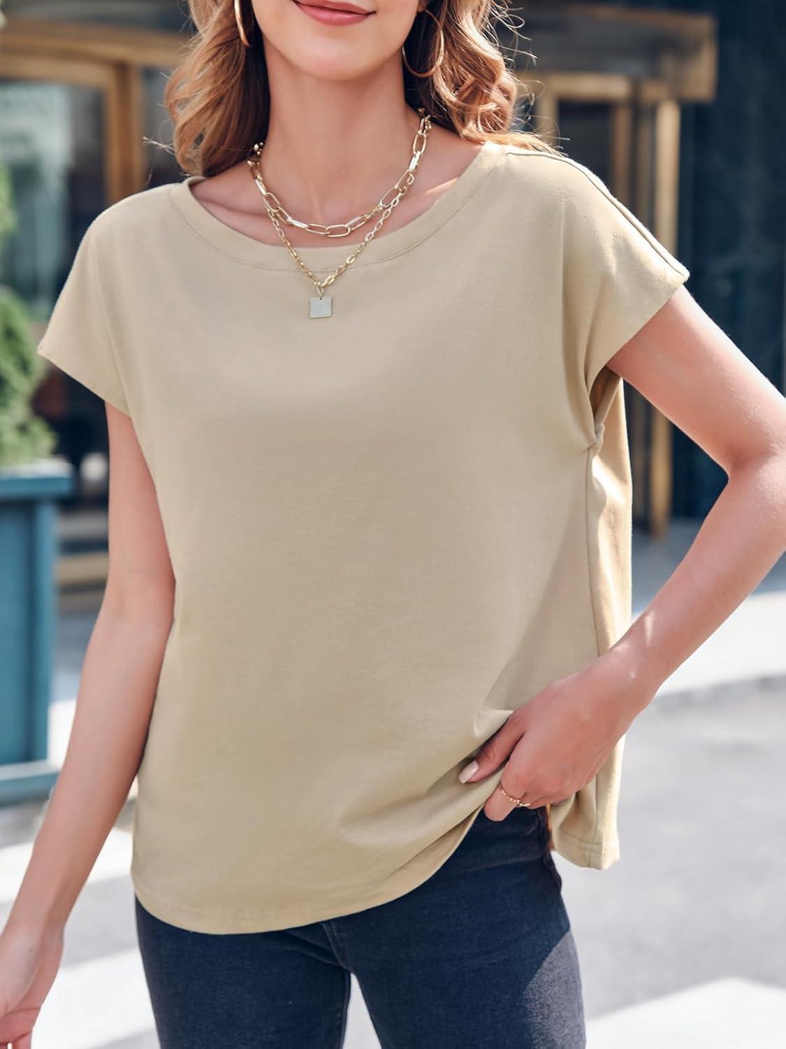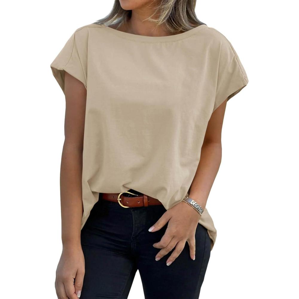 Tankaneo Womens Cap Sleeve Tops Boat Neck T-Shirts Summer Casual Loose Fit Basic Tees(Khaki)