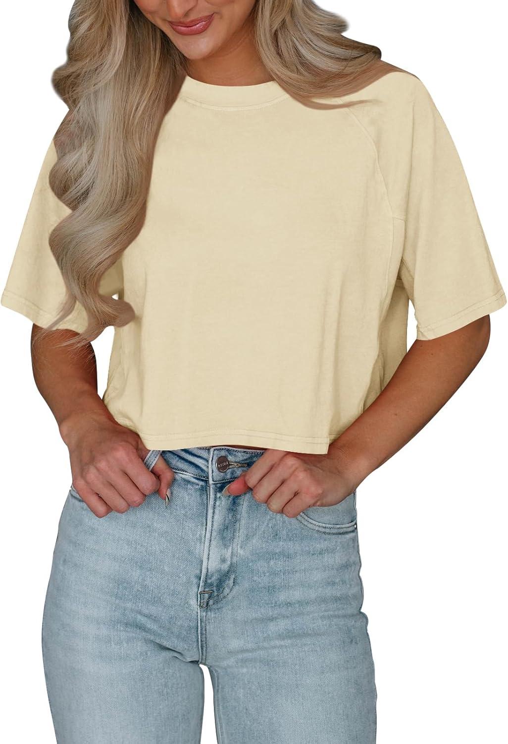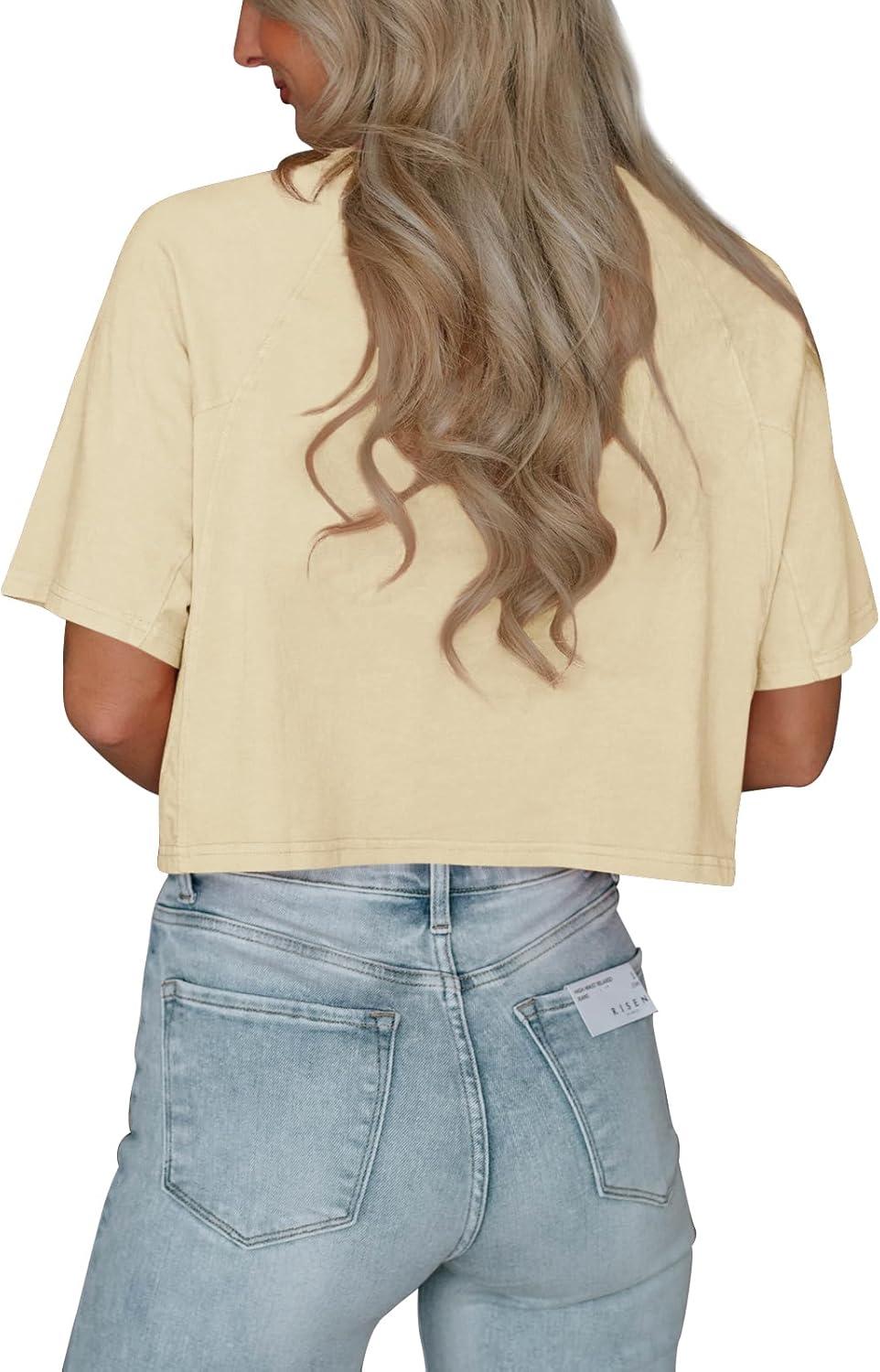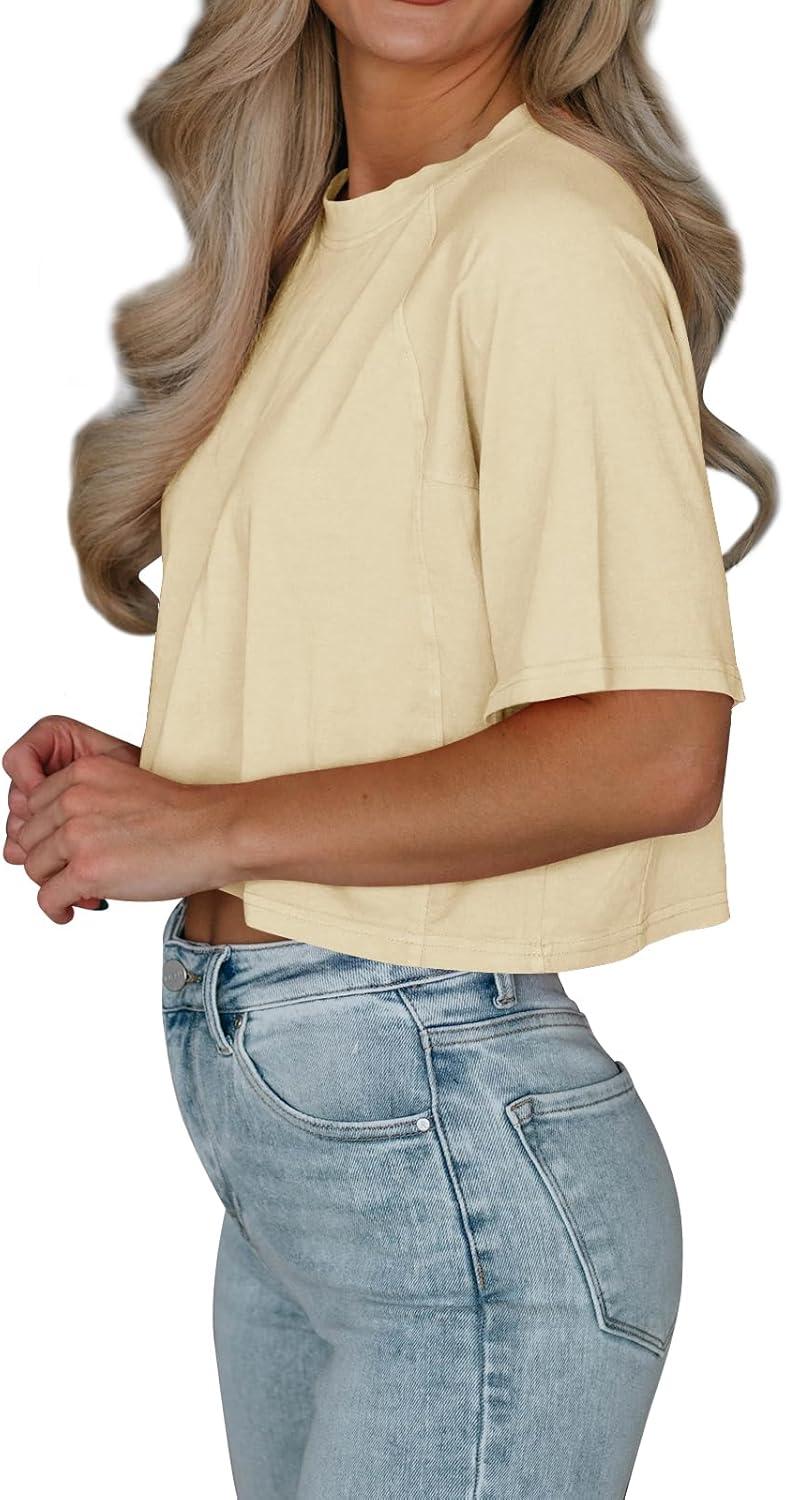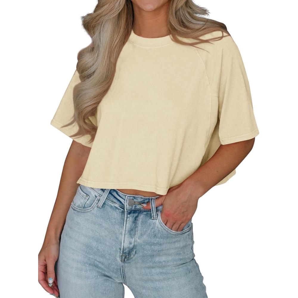 Tankaneo Womens Casual Half Sleeve Cropped T-Shirts Summer Crop Tops Solid Color Round Neck Basic Crop Tees(05-beige)