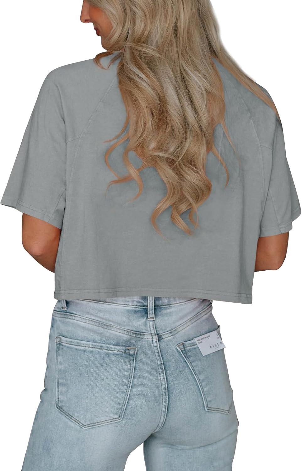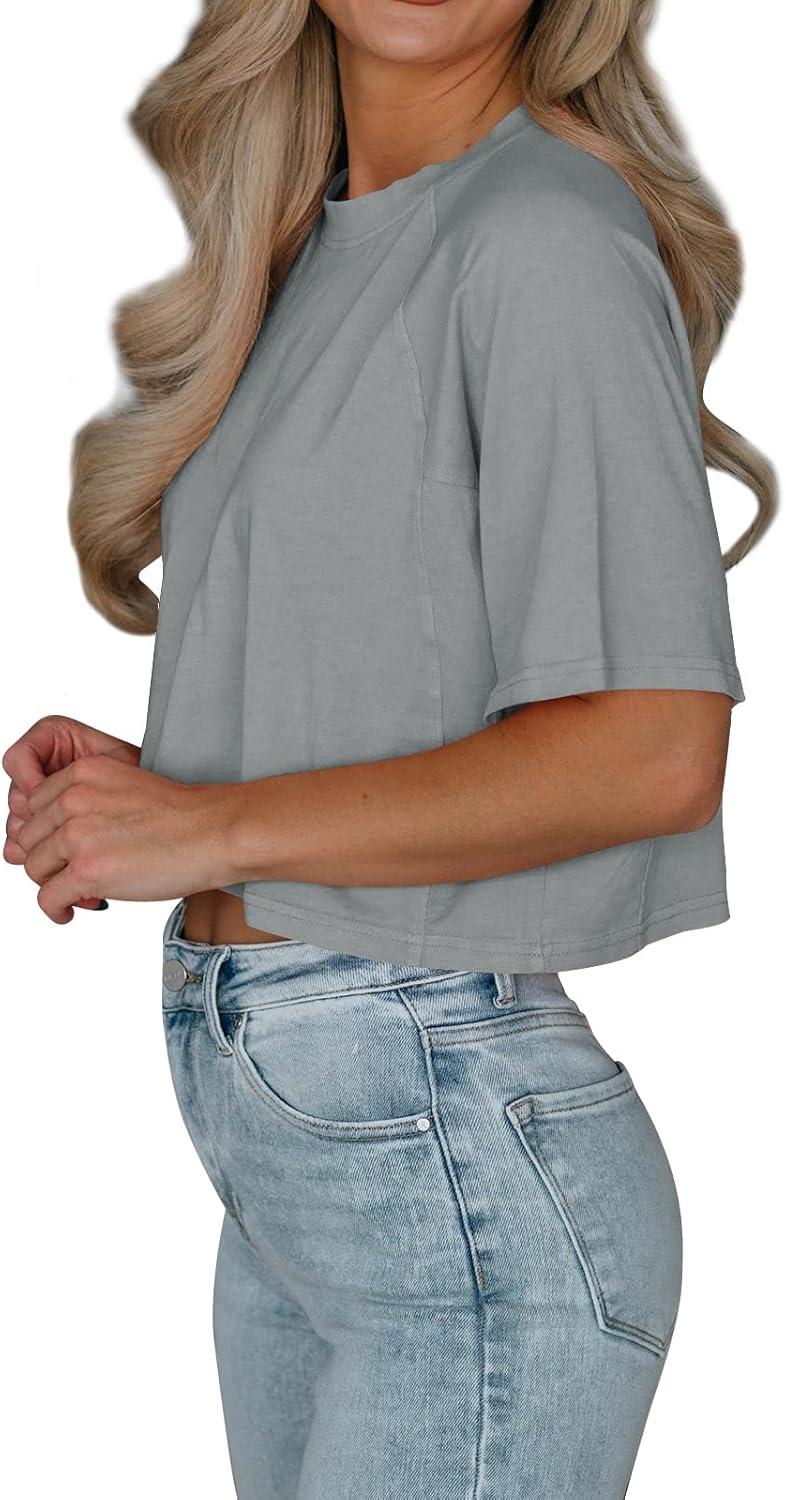 Tankaneo Womens Casual Half Sleeve Cropped T-Shirts Summer Crop Tops Solid Color Round Neck Basic Crop Tees(07-grey)