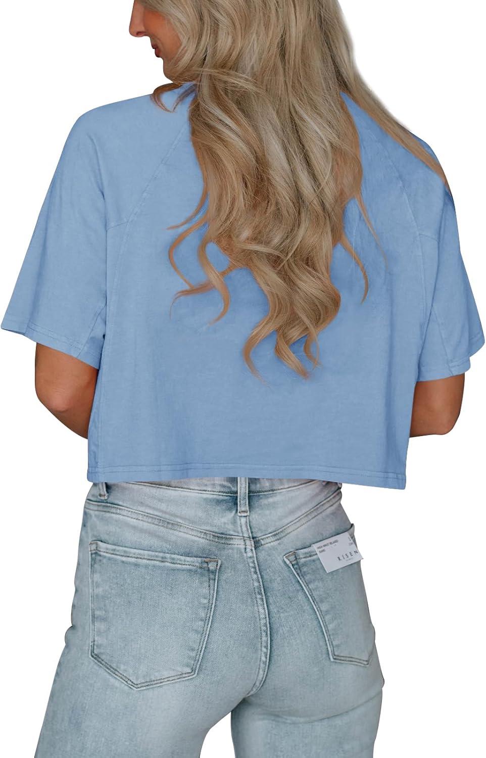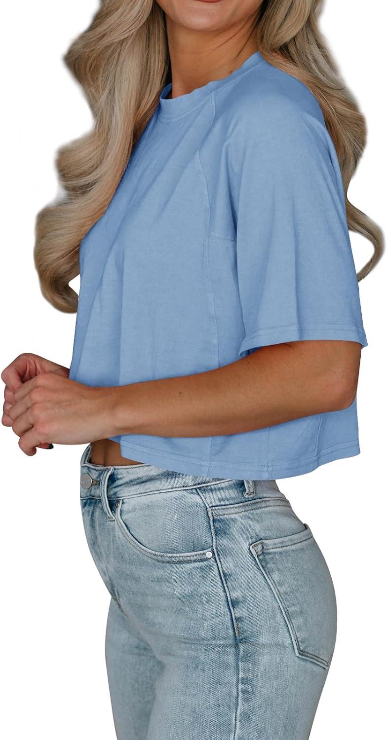 Tankaneo Womens Casual Half Sleeve Cropped T-Shirts Summer Crop Tops Solid Color Round Neck Basic Crop Tees(09-light Blue)