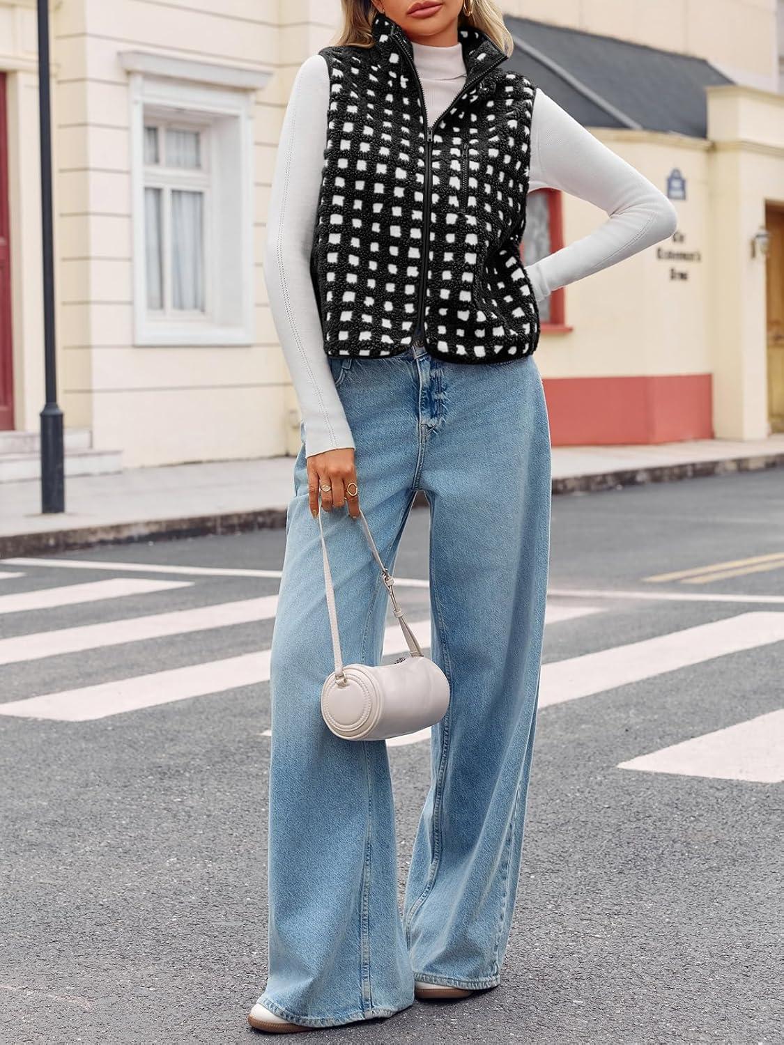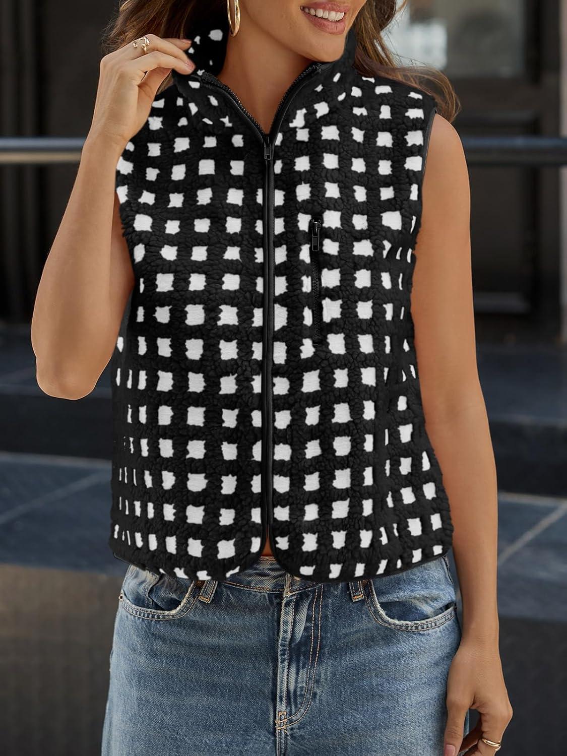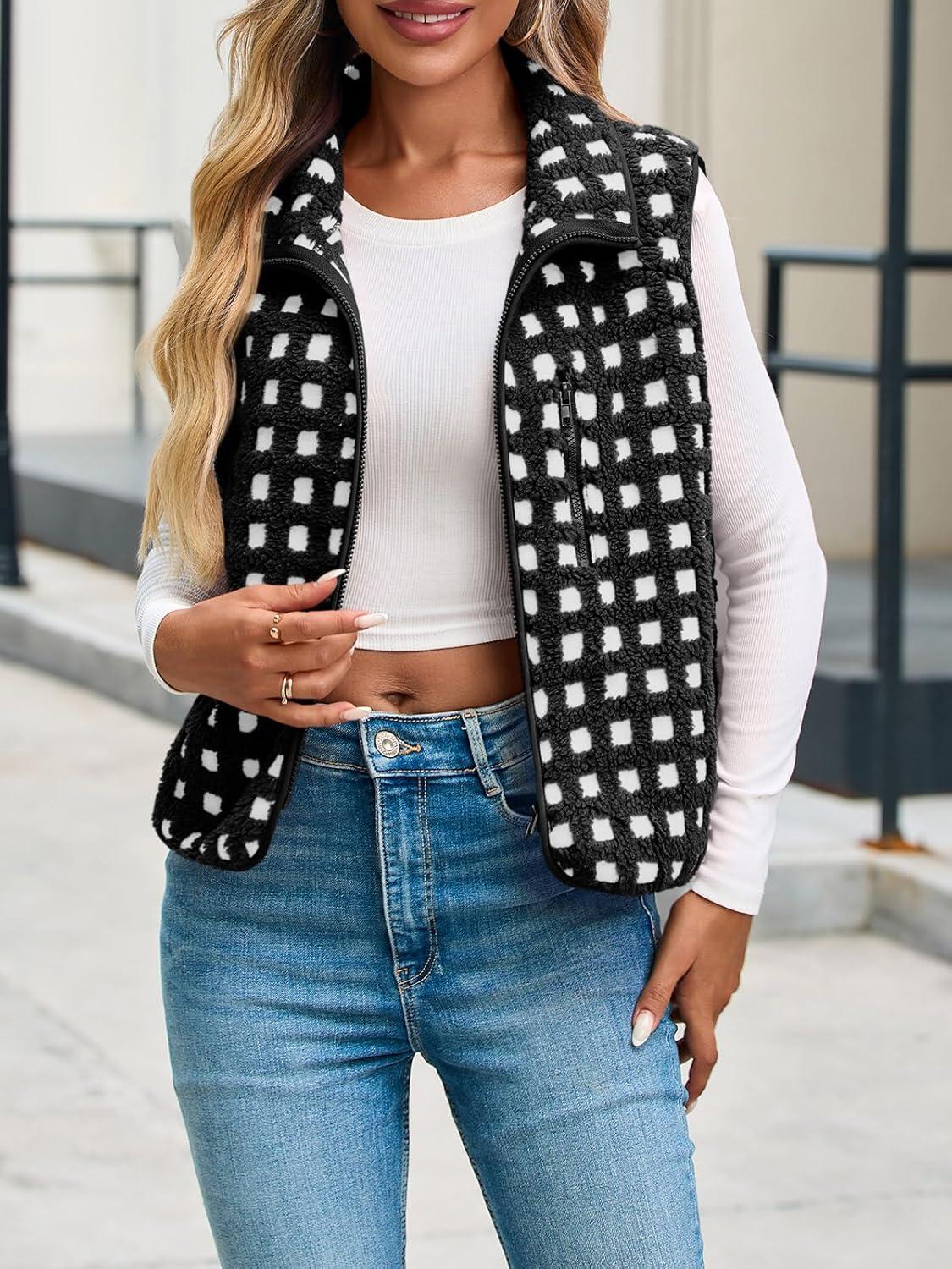 Tankaneo Womens Checkered Sherpa Vest Fleece Fuzzy Zip Up Sleeveless Jacket Casual 2025 Winter Warm Outwear(Black)