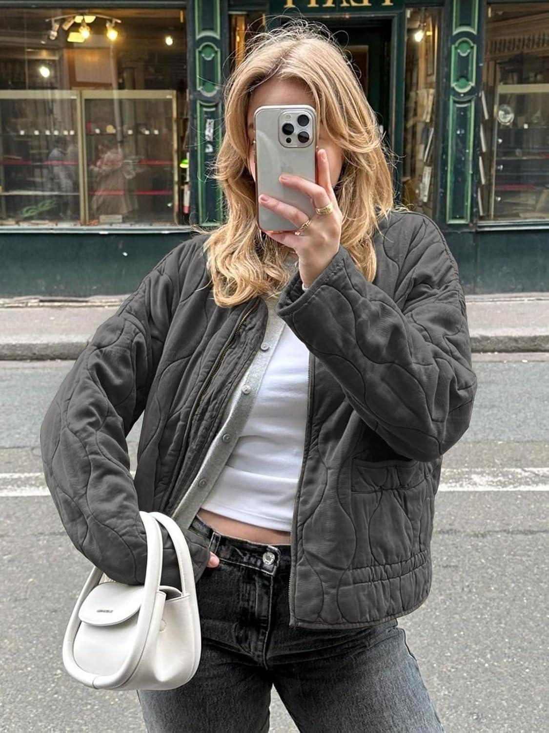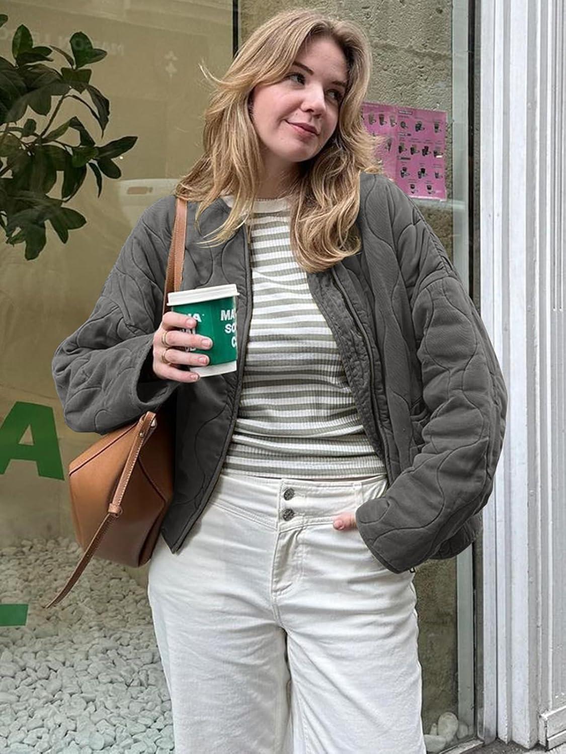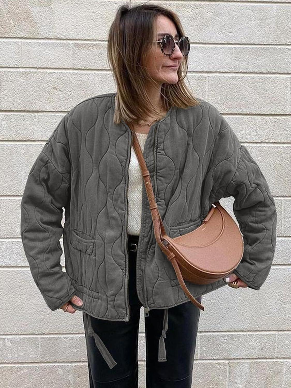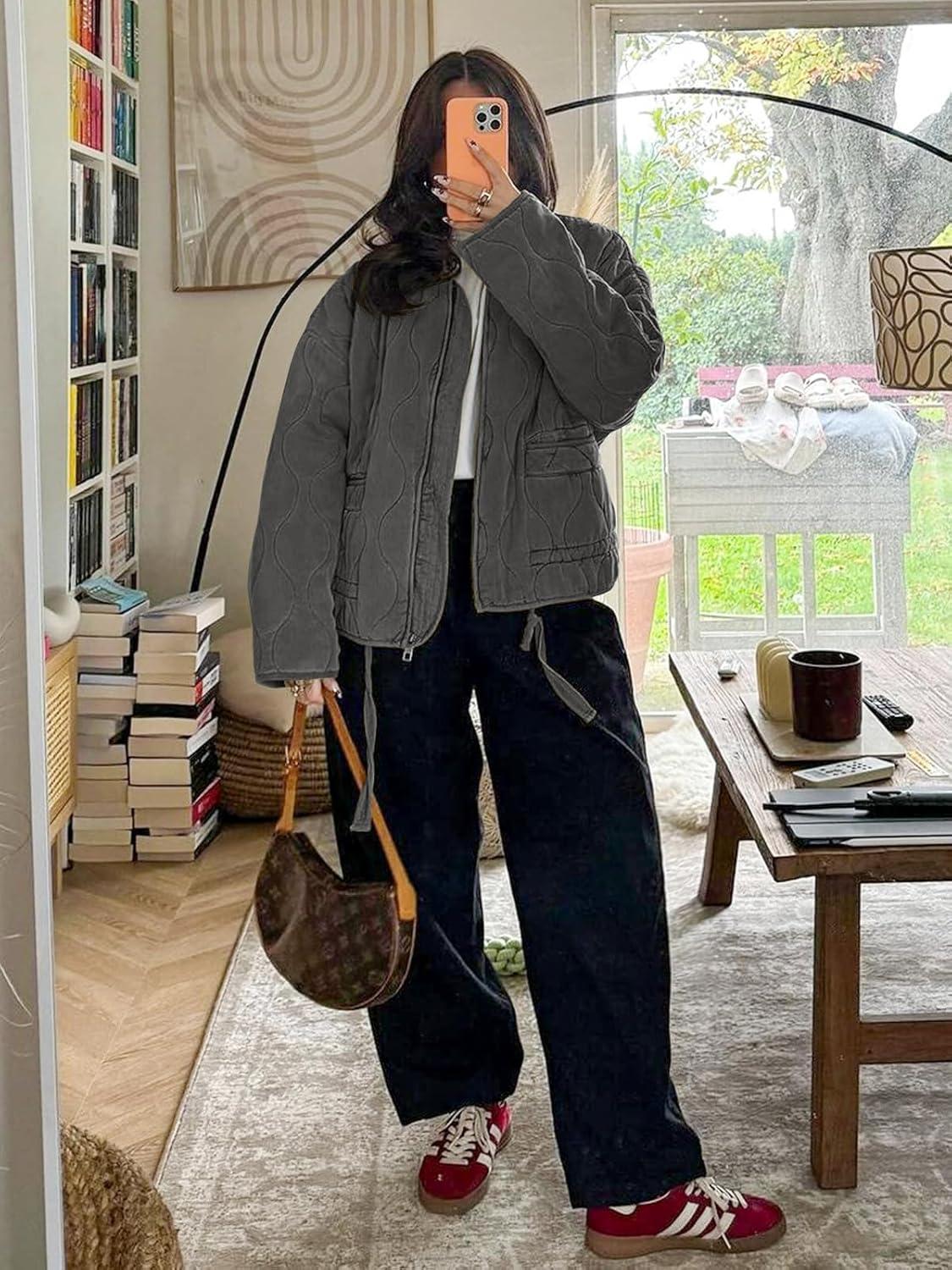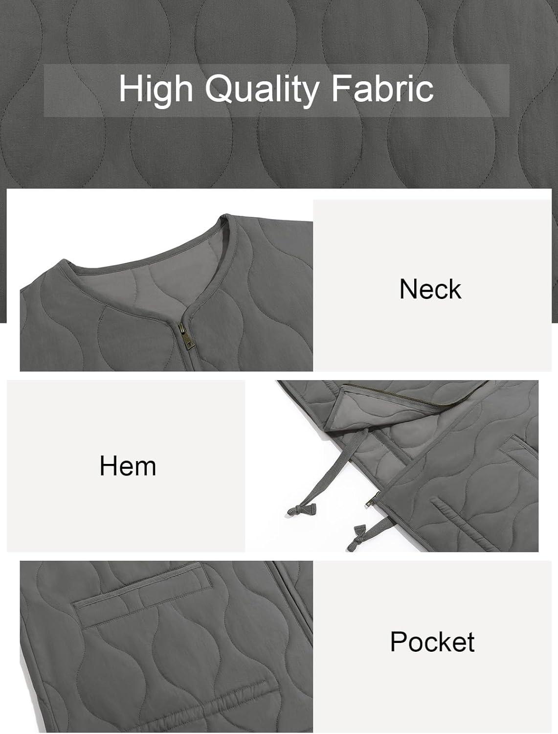 Tankaneo Womens Collarless Lightweight Quilted Jackets Casual Oversized Puffer Coats Zip Up Drawstring Outerwear(Grey)