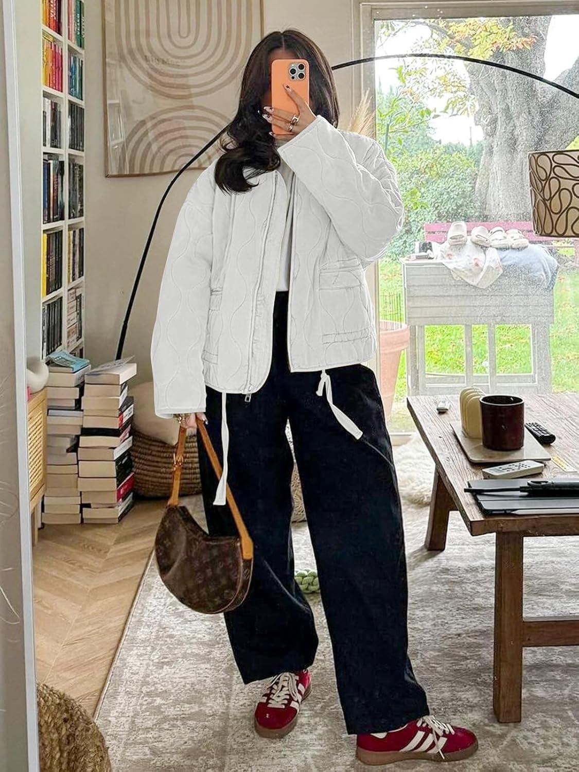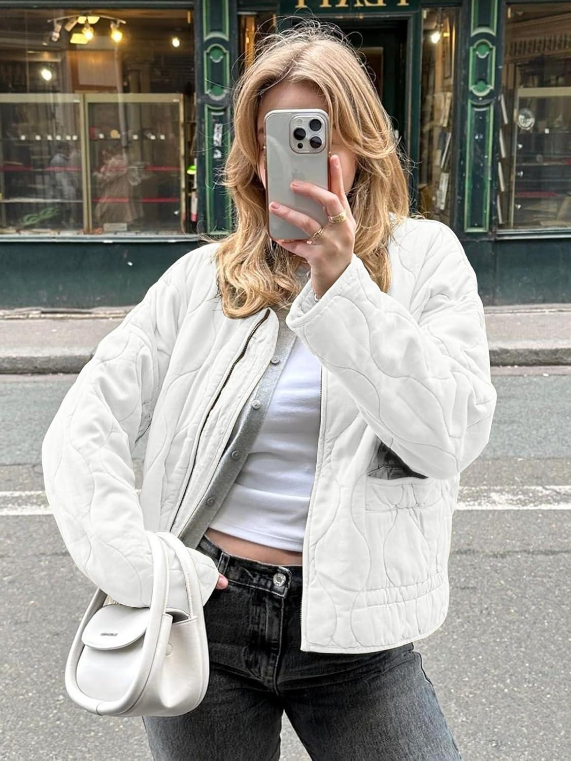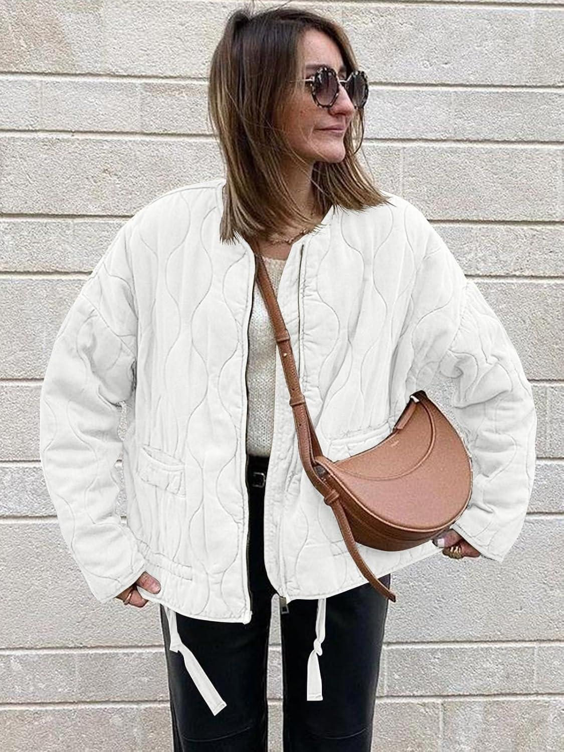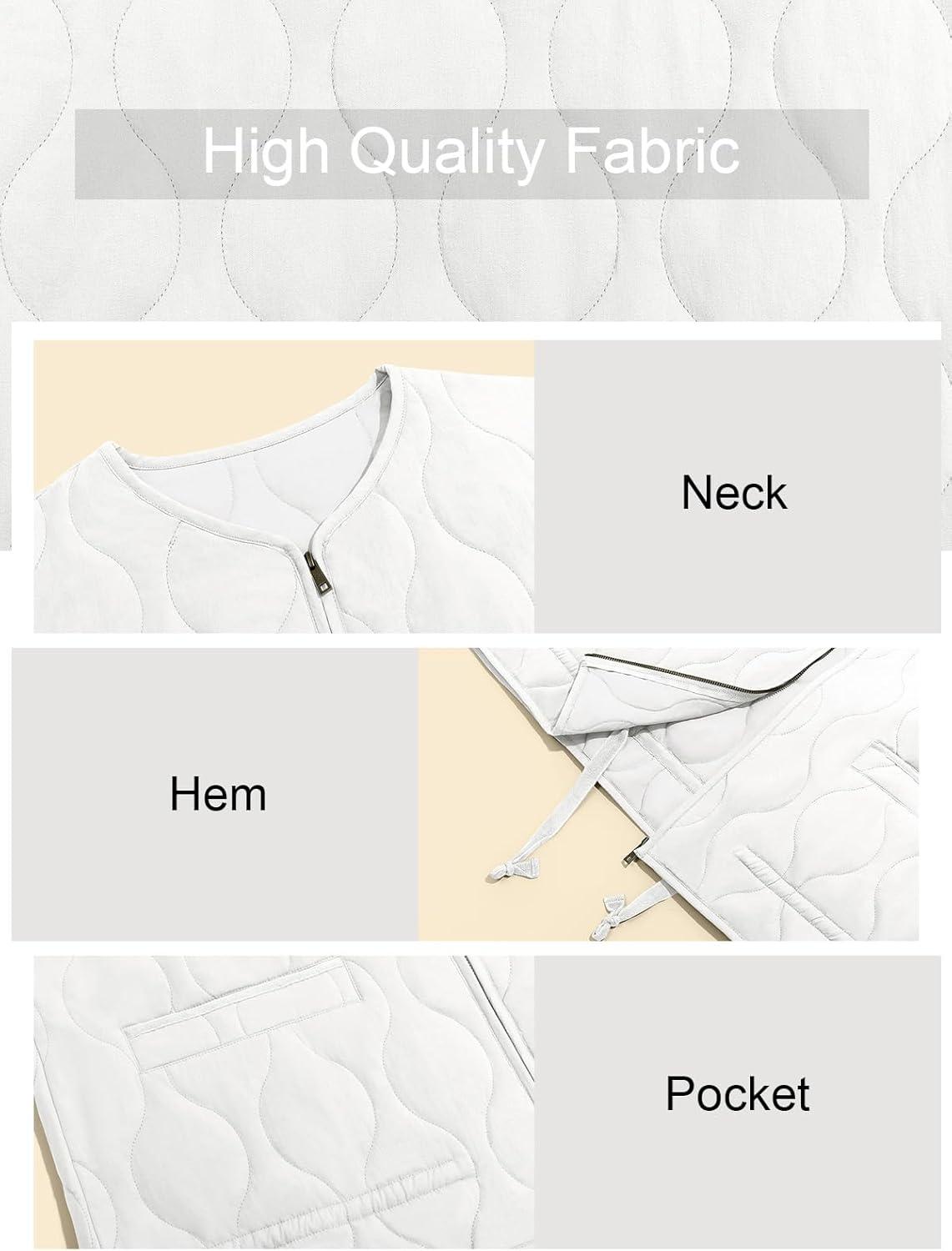 Tankaneo Womens Collarless Lightweight Quilted Jackets Casual Oversized Puffer Coats Zip Up Drawstring Outerwear(White)
