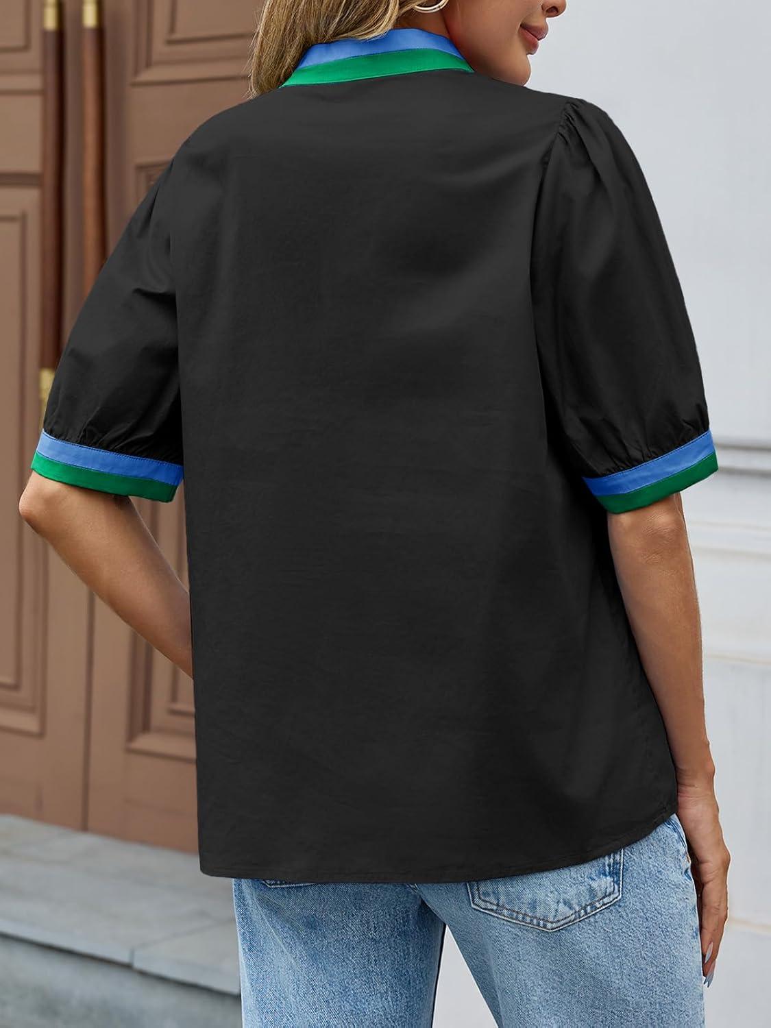 Tankaneo Womens Color Block Puff Sleeve Tops Dressy Casual V Neck Cotton Blouses Summer Loose Fit Tees Shirts(Black)