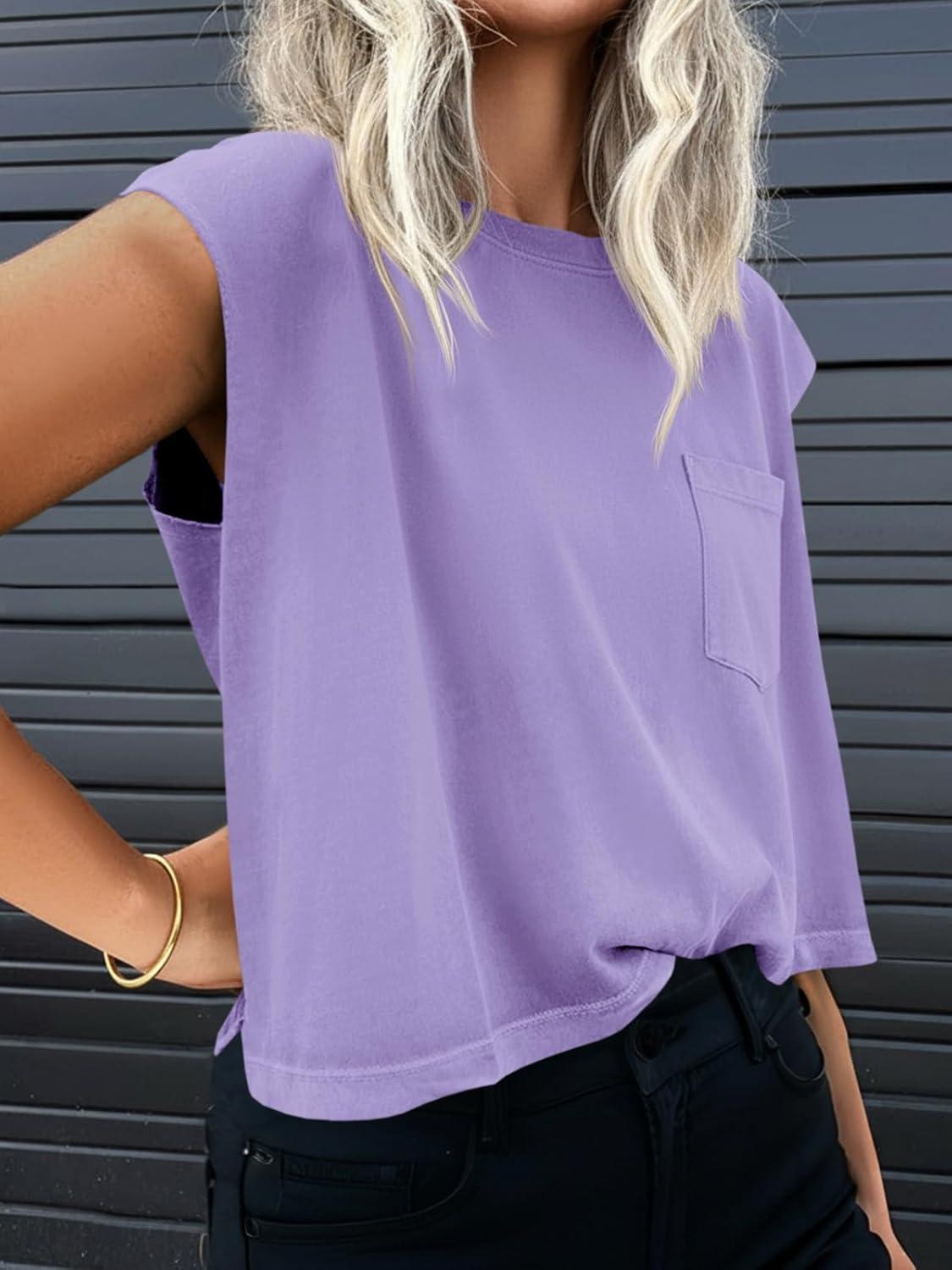 Tankaneo Womens Crop Tank Top Cap Sleeve Summer Tops Loose Casual Basic Crewneck Shirts with Pockets(Violet)