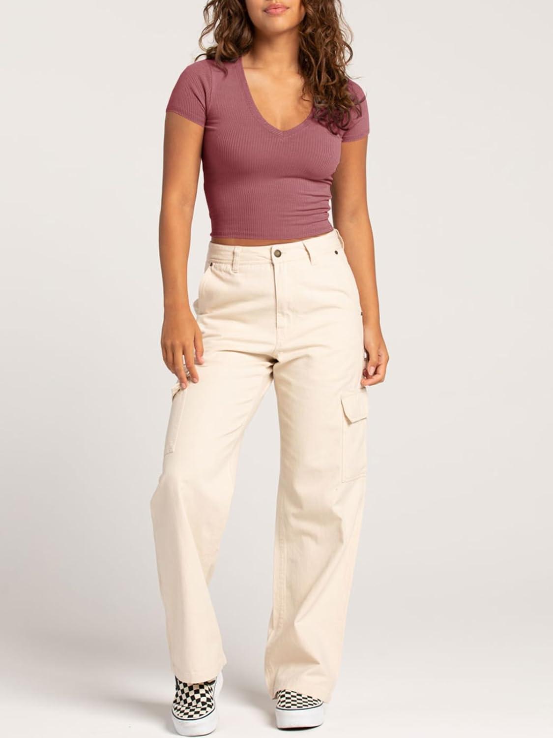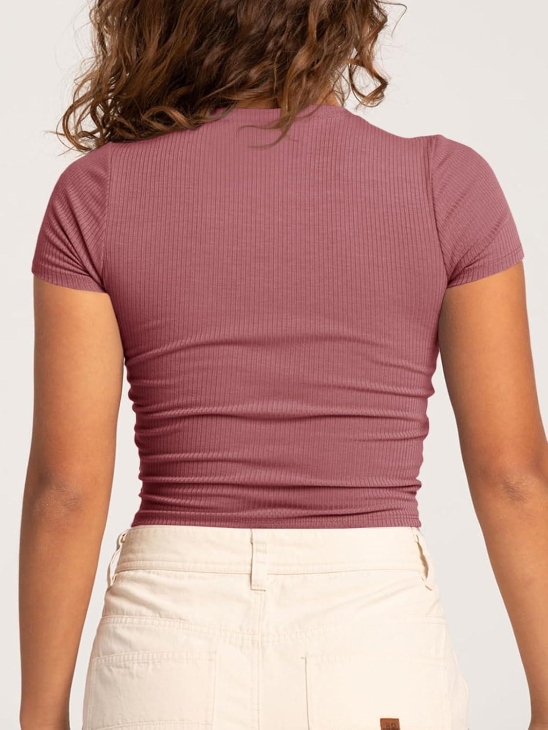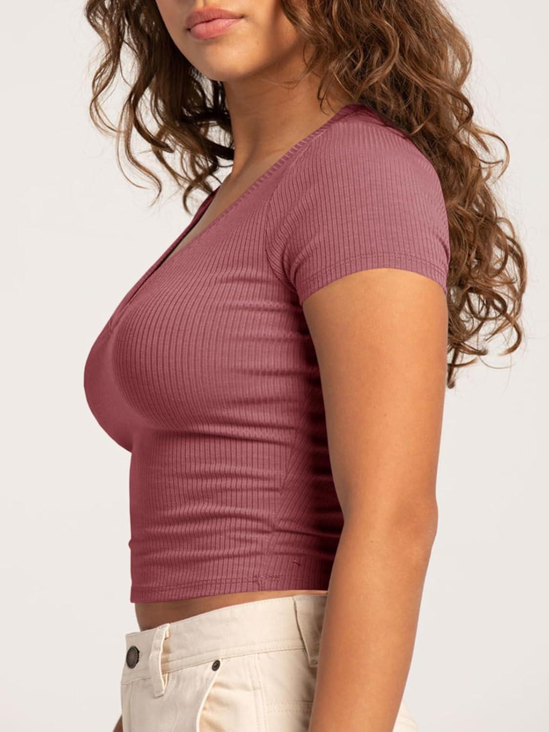 Tankaneo Womens Crop Tops Ribbed V Neck Short Sleeve Summer Basic Tees Slim Fit Y2k Shirts(Brick Red)