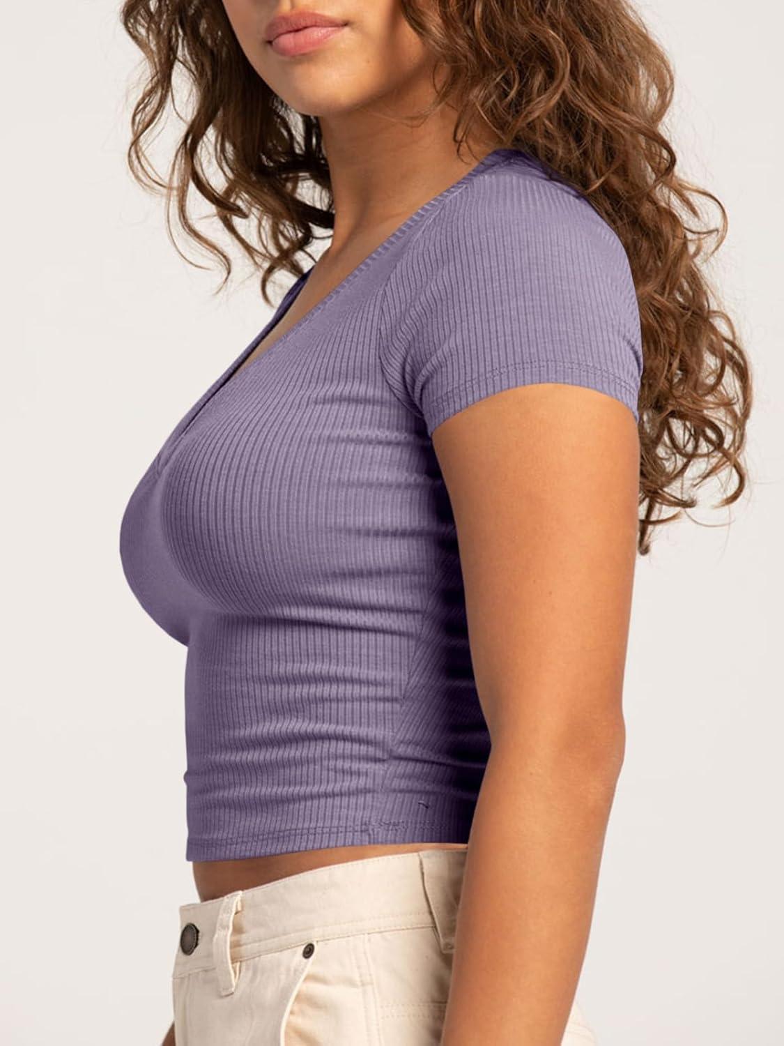 Tankaneo Womens Crop Tops Ribbed V Neck Short Sleeve Summer Basic Tees Slim Fit Y2k Shirts(Lavender)