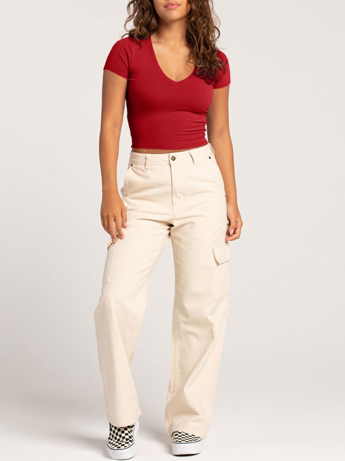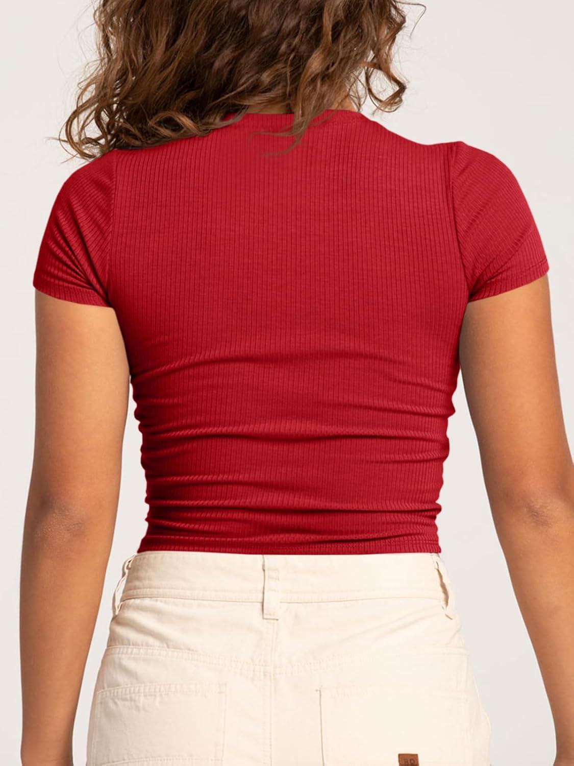 Tankaneo Womens Crop Tops Ribbed V Neck Short Sleeve Summer Basic Tees Slim Fit Y2k Shirts(Red)