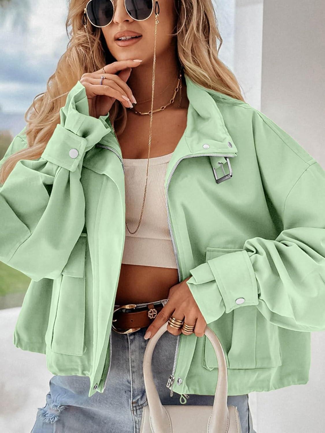 Tankaneo Womens Cropped Bomber Jacket Long Sleeve Zip Up Casual Coats Loose Fit Outerwear with Pockets(Green)