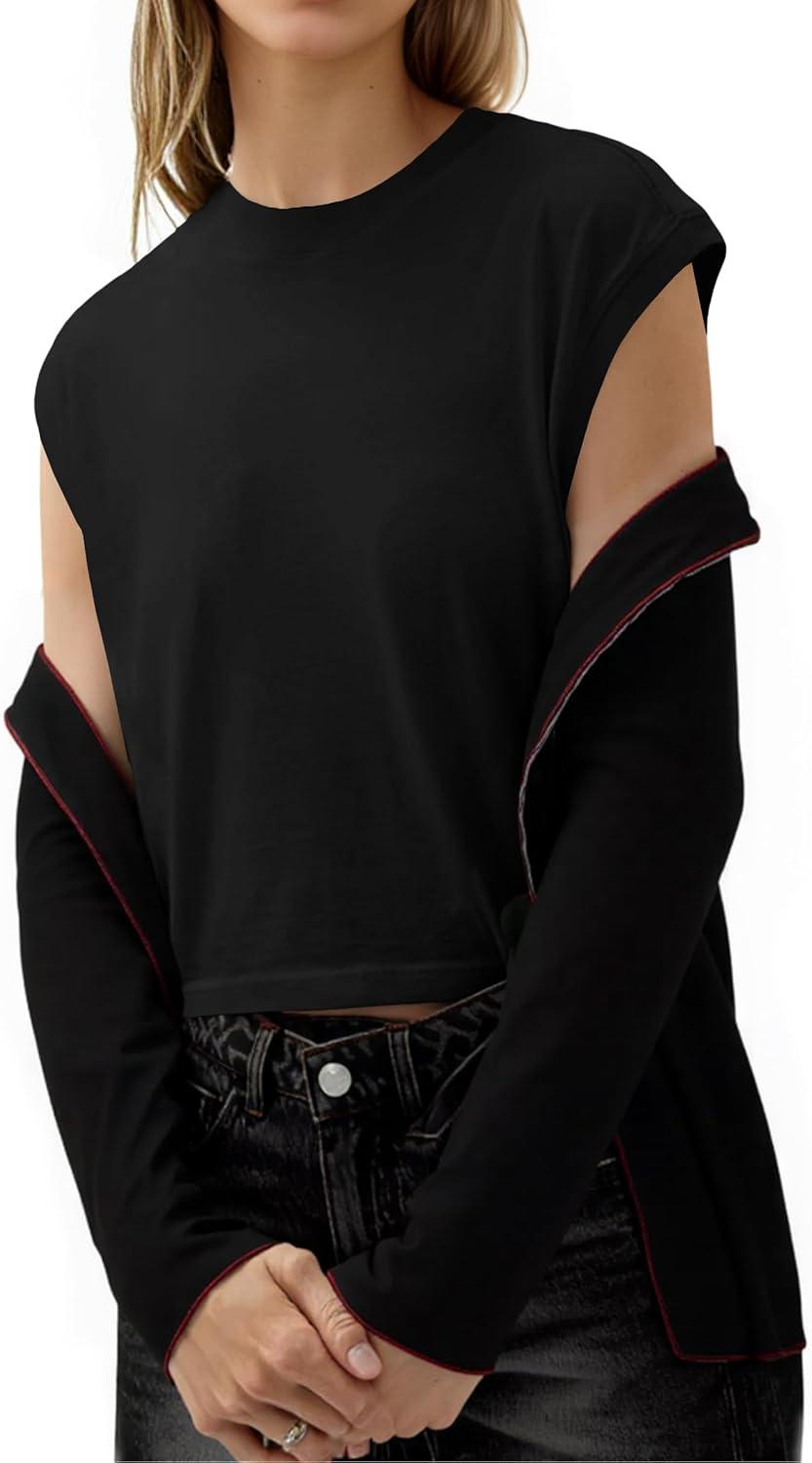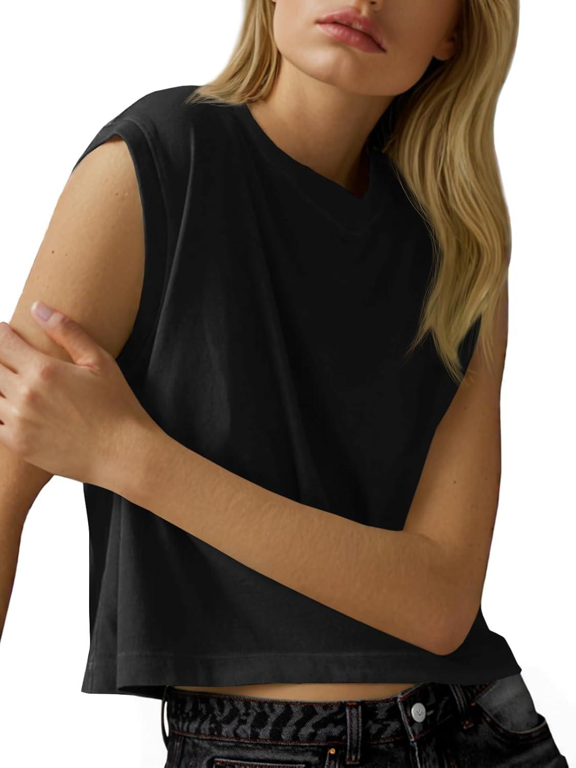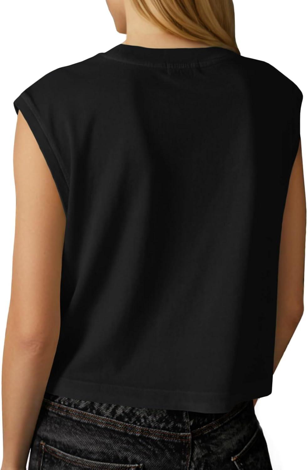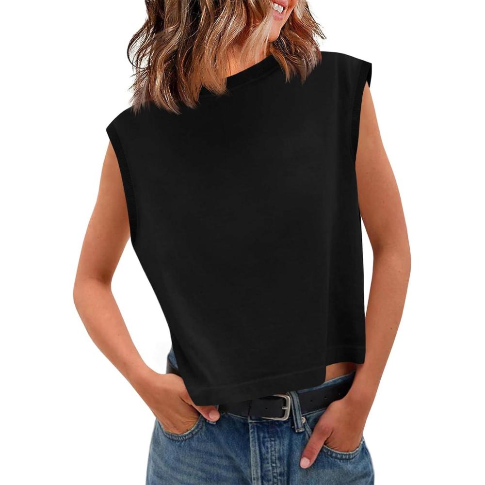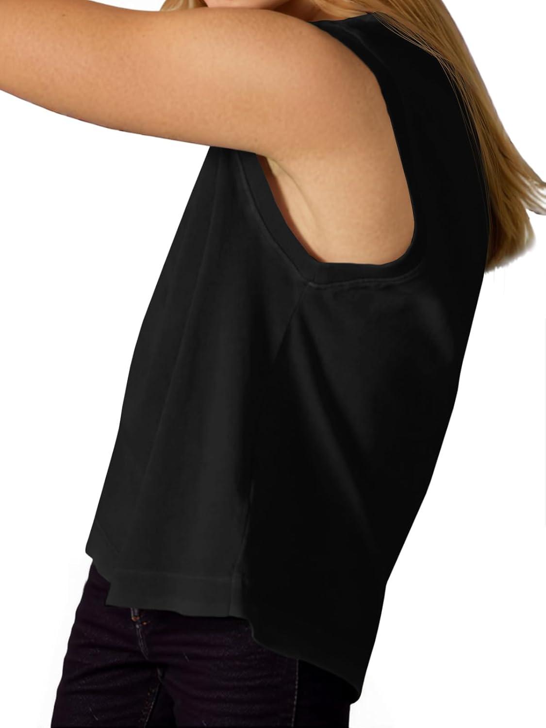 Tankaneo Womens Cropped Cap Sleeve Tank Tops Summer Casual Loose Fit Basic Tee Shirts(Black)