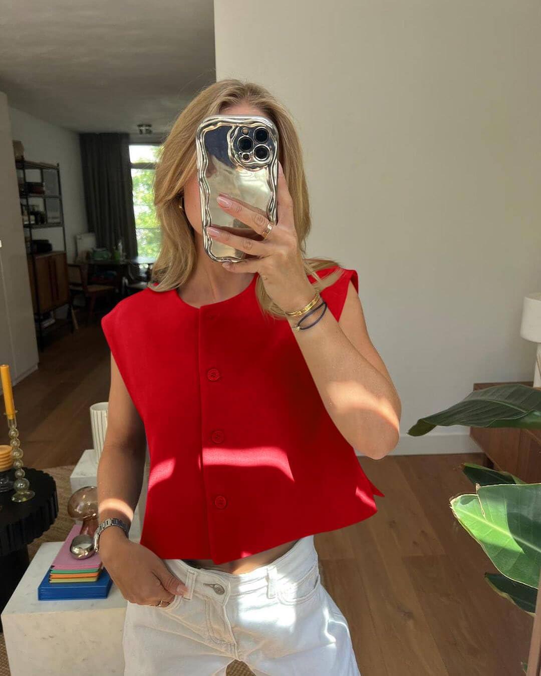 Tankaneo Womens Cropped Cap Sleeve Vest Tank Tops Summer Work Casual Crew Neck Button Down Waistcoats(Red)