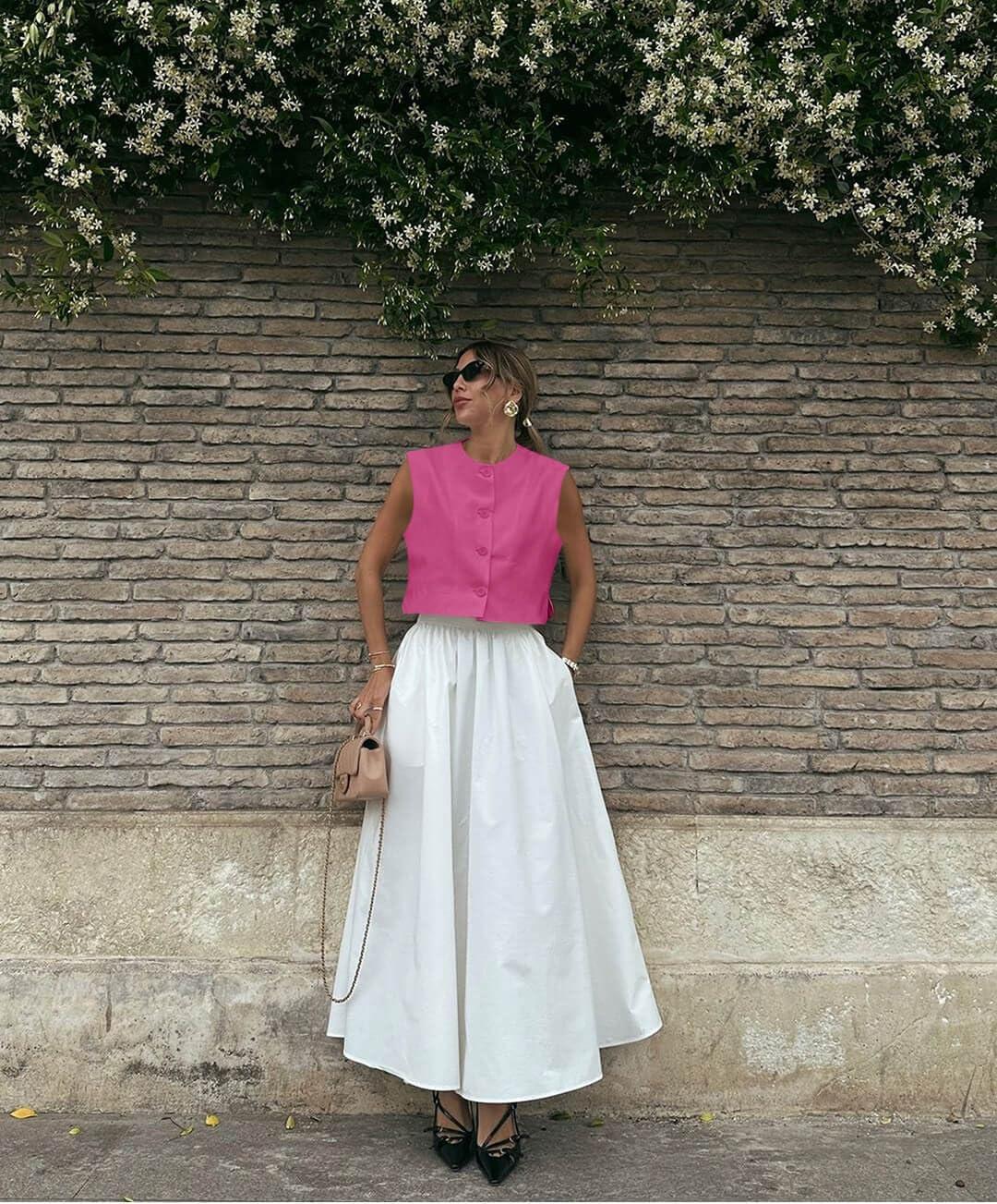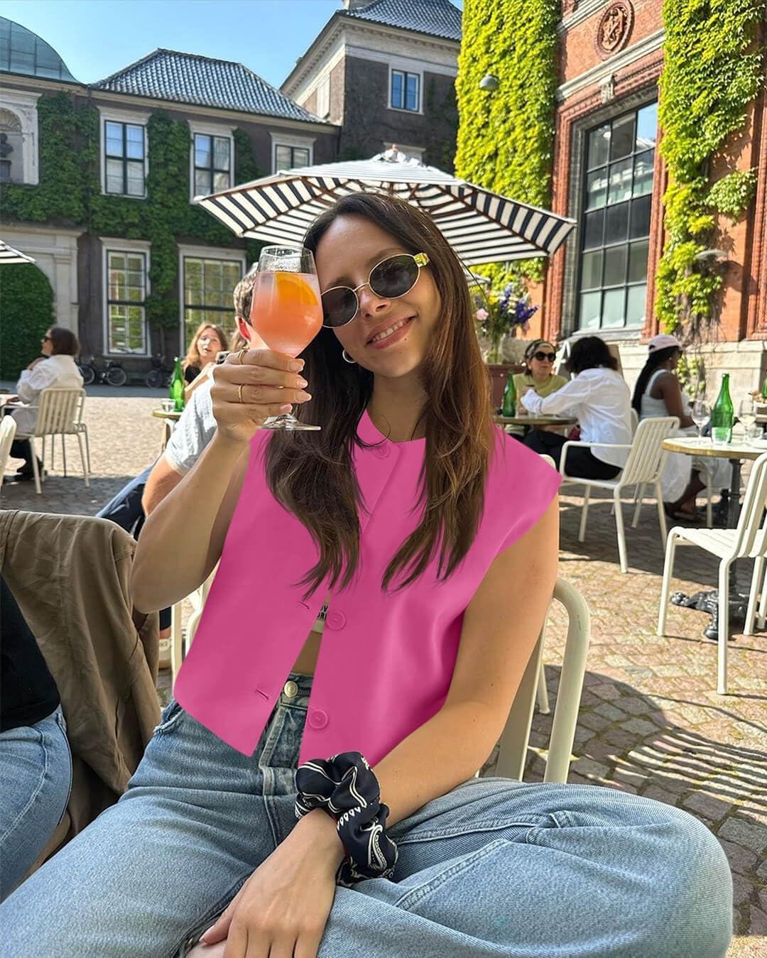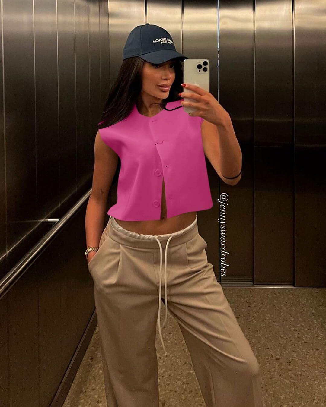 Tankaneo Womens Cropped Cap Sleeve Vest Tank Tops Summer Work Casual Crew Neck Button Down Waistcoats(Rose Red)