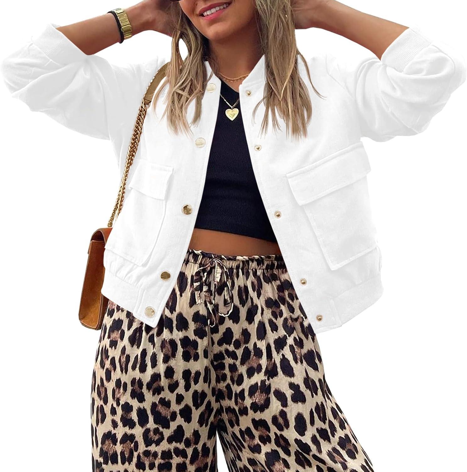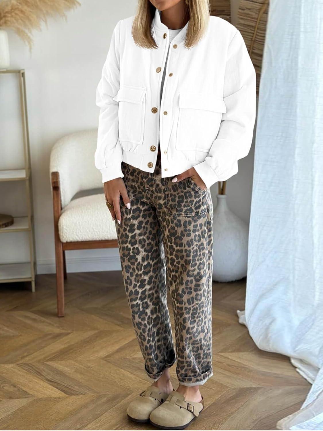 Tankaneo Womens Cropped Puffer Bomber Jacket Winter Casual Button Down Varsity Coats with Pockets(White)