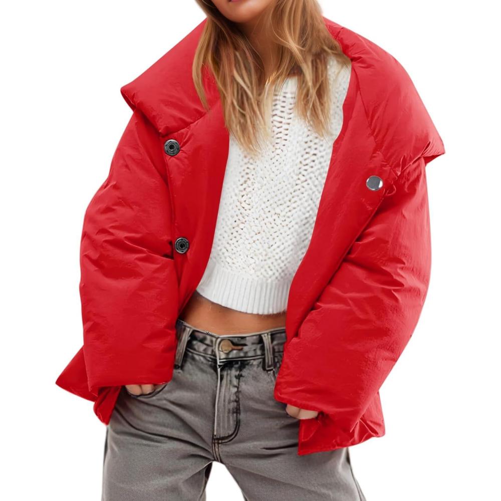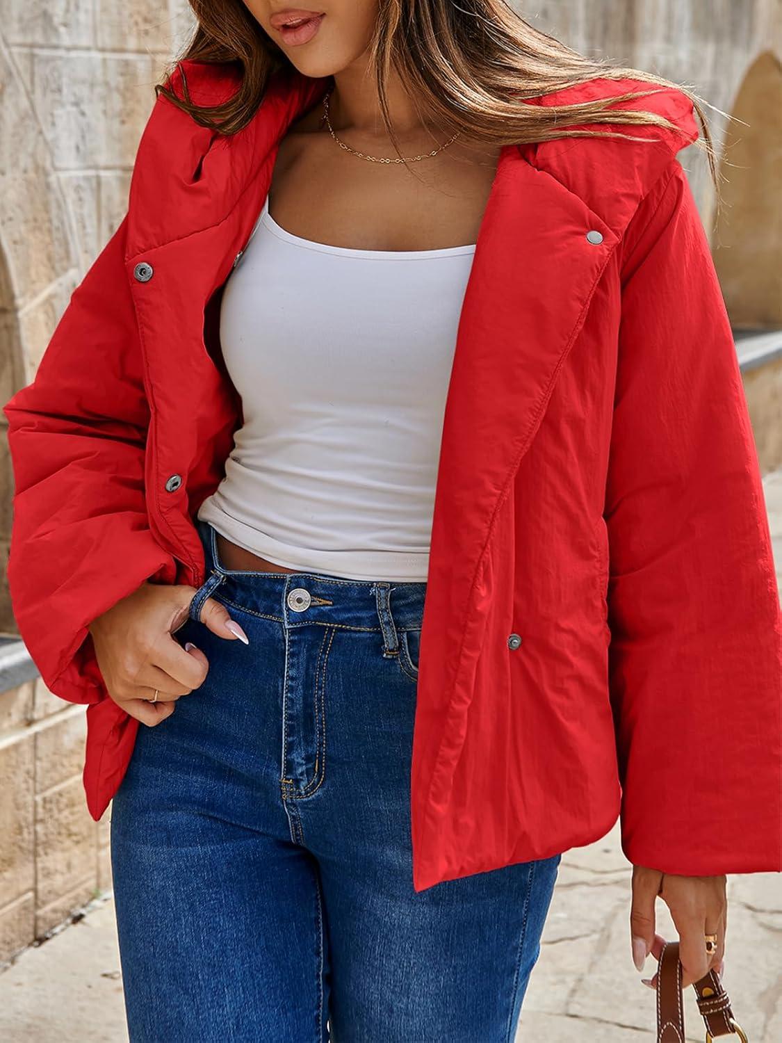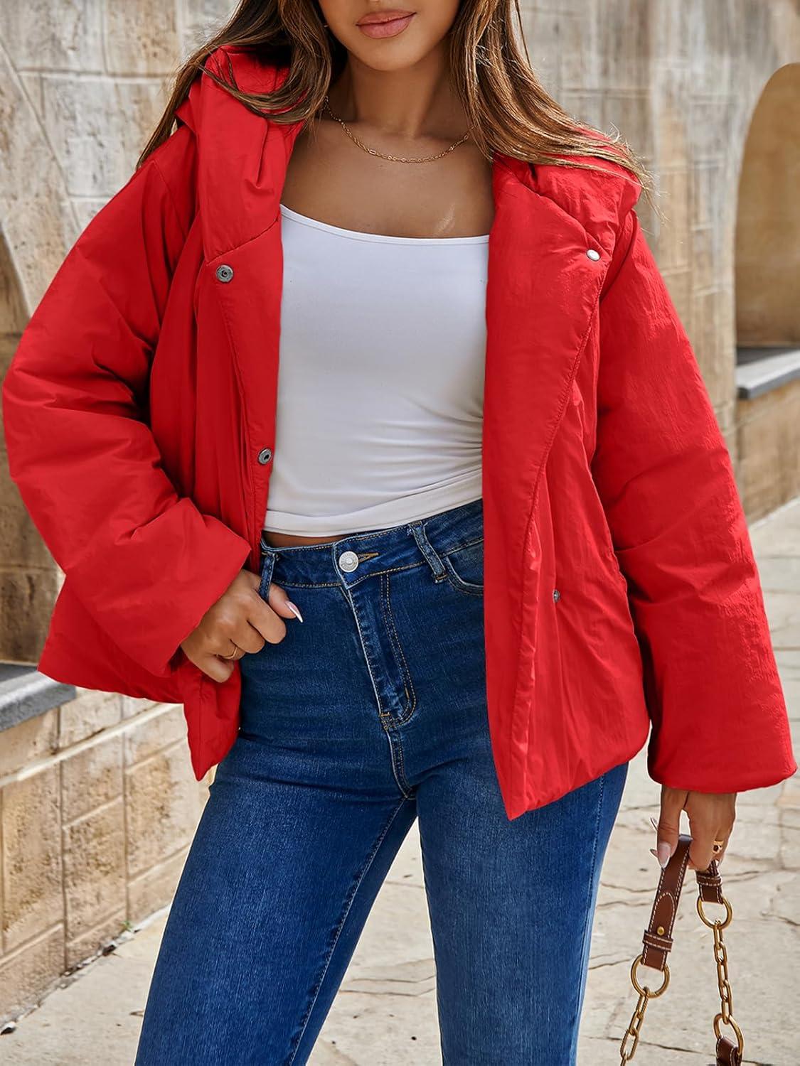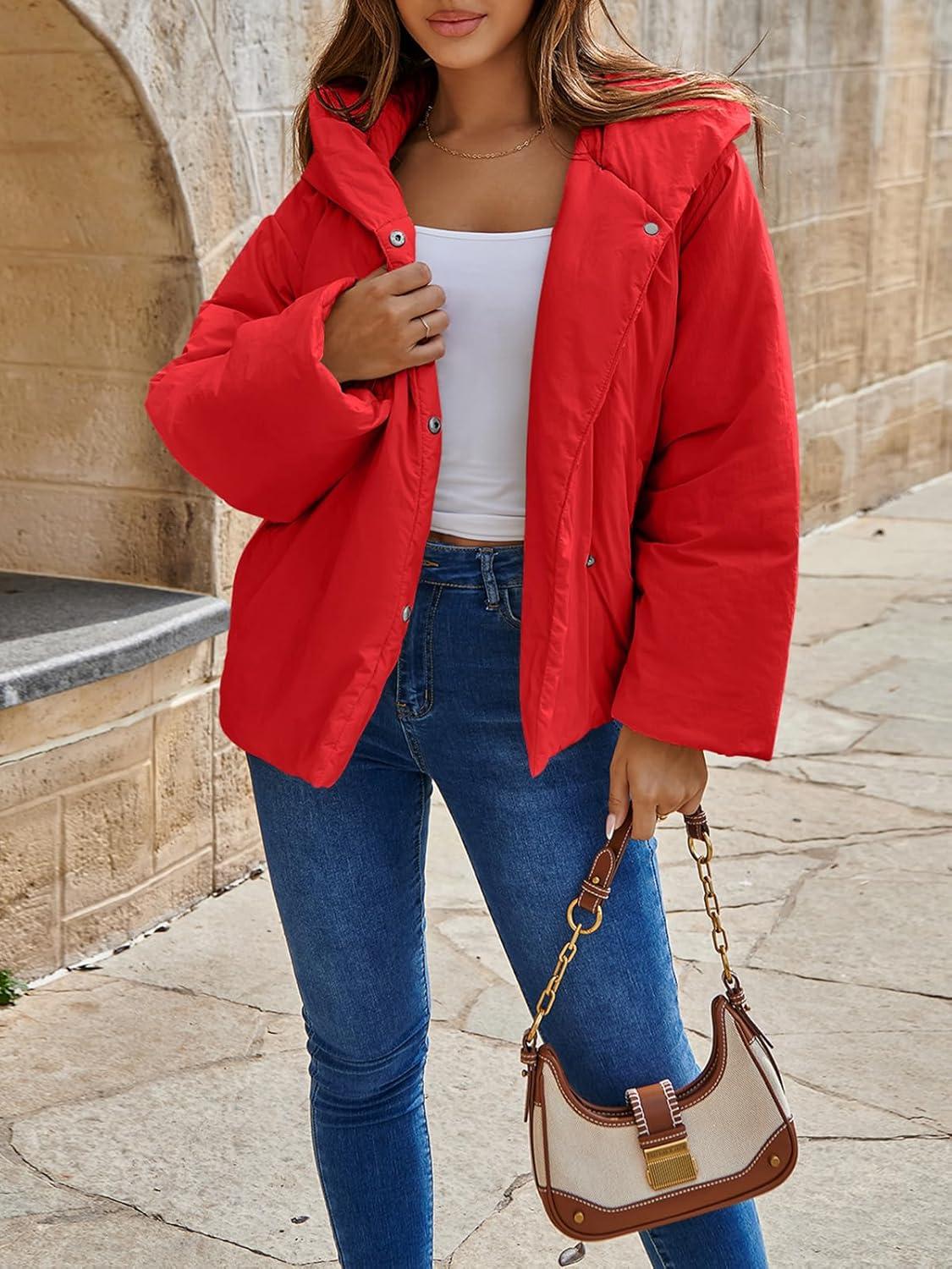 Tankaneo Womens Cropped Puffer Coat Hoodies Oversized Lightweight Winter Jacket Warm Long Sleeve Outerwear(Red)