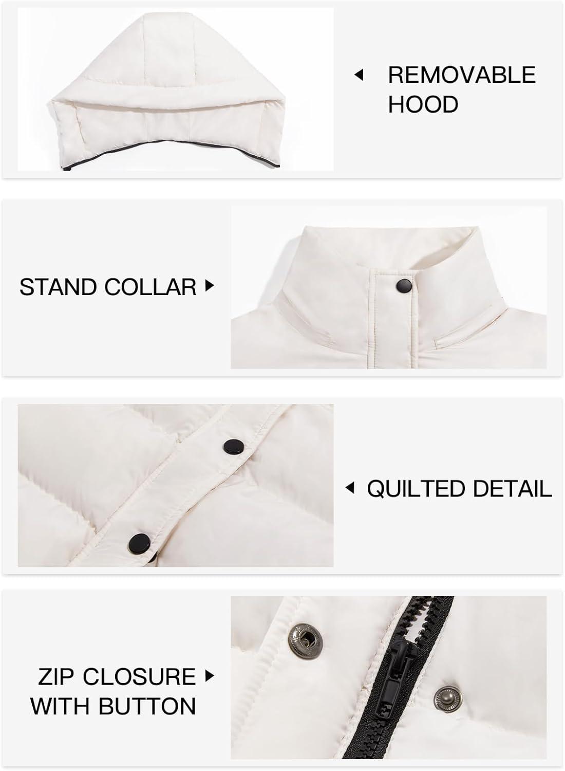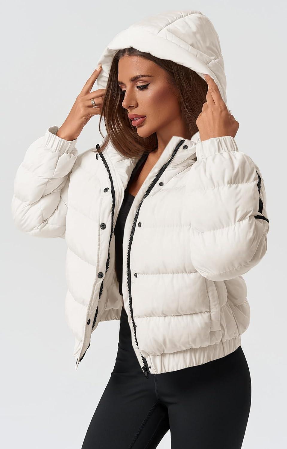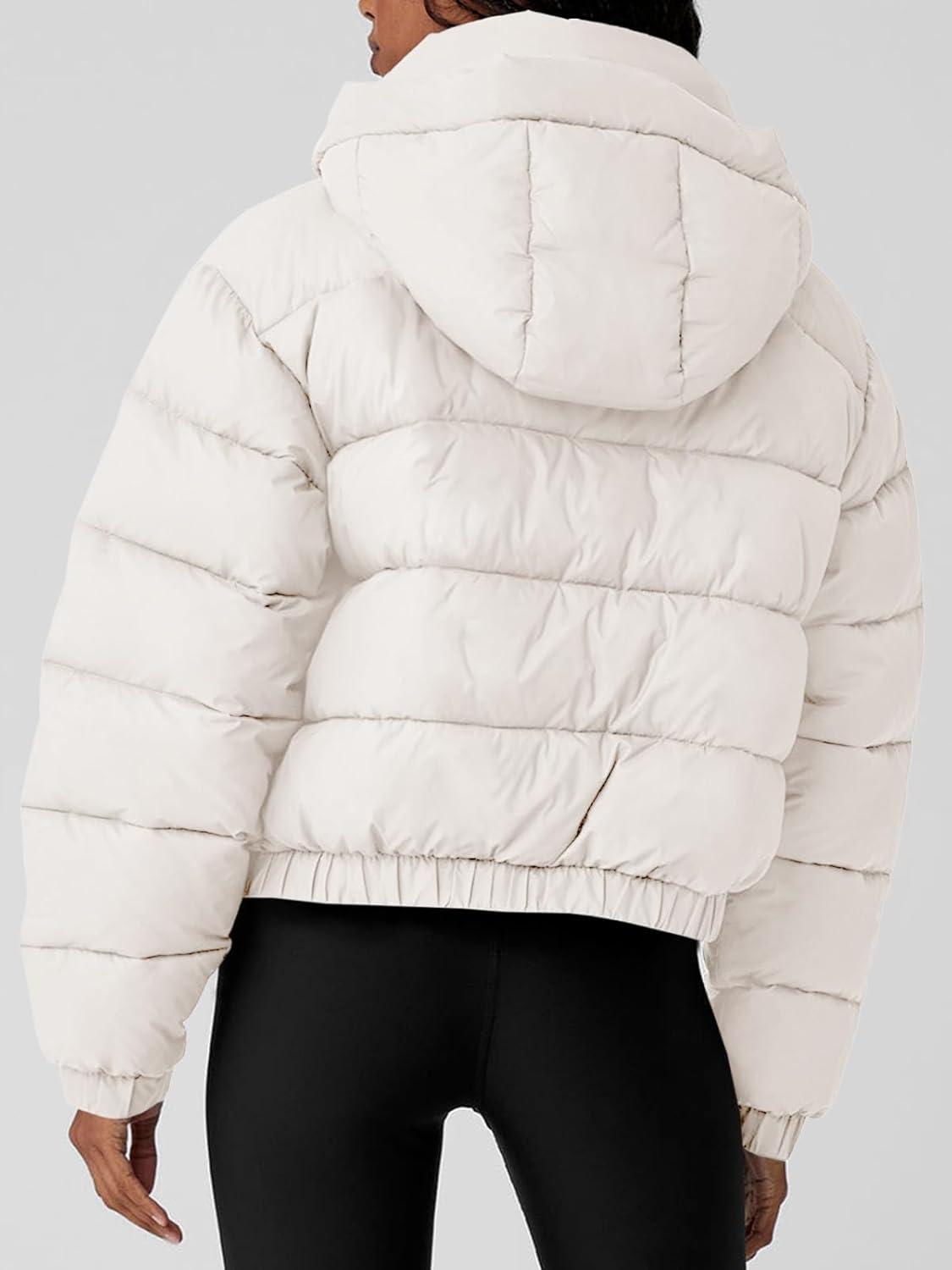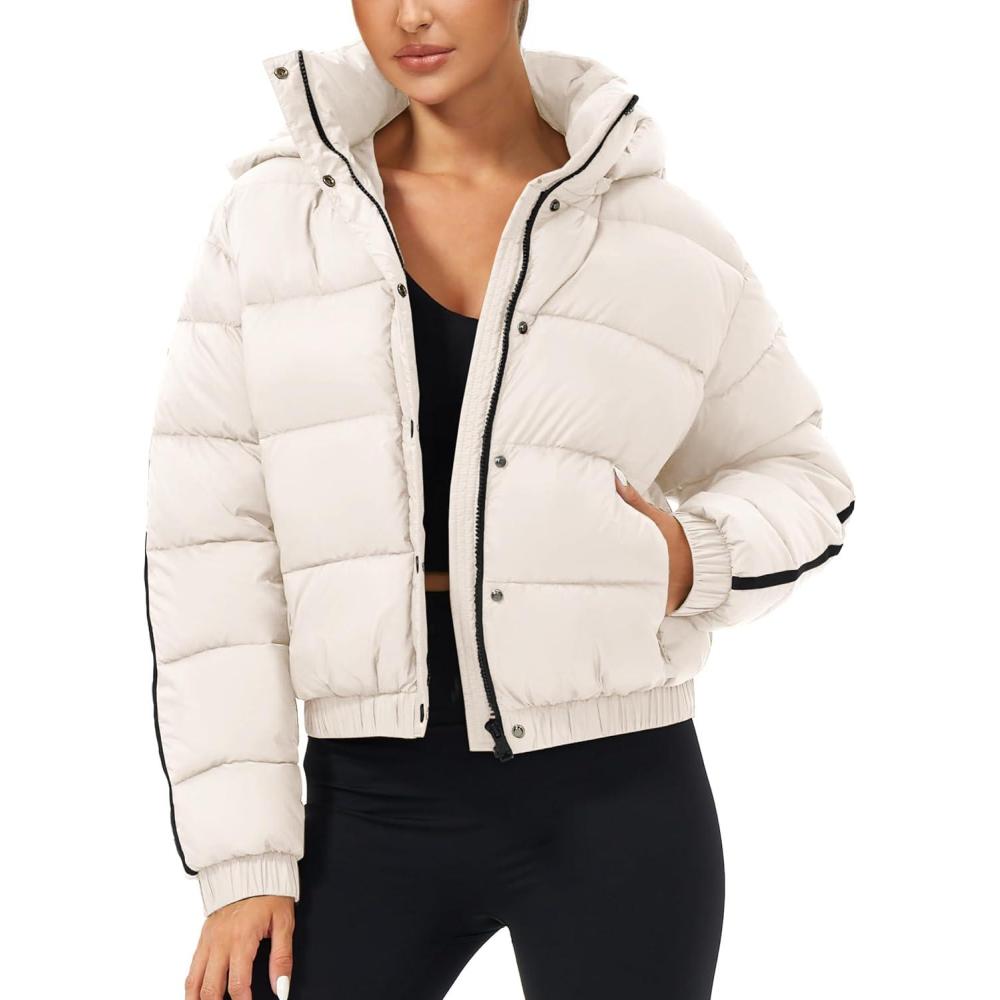 Tankaneo Womens Cropped Puffer Jacket Hooded Quilted Contrast Trim Short Down Coats Outerwear Winter Outfits(Beige)