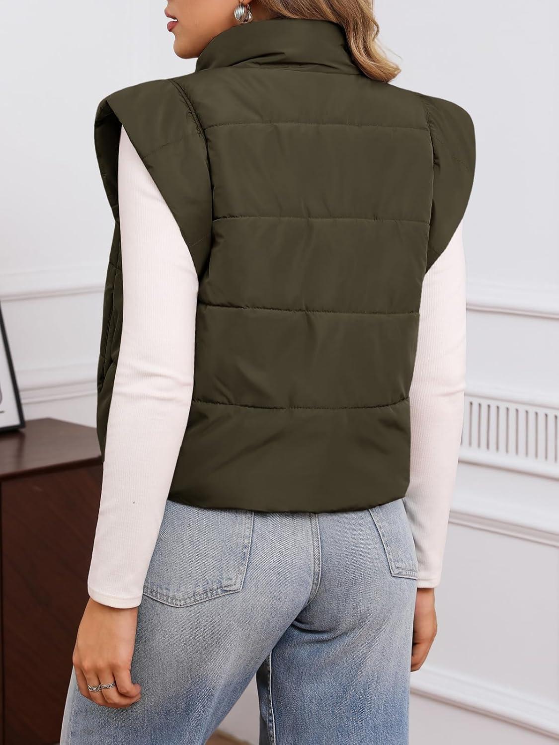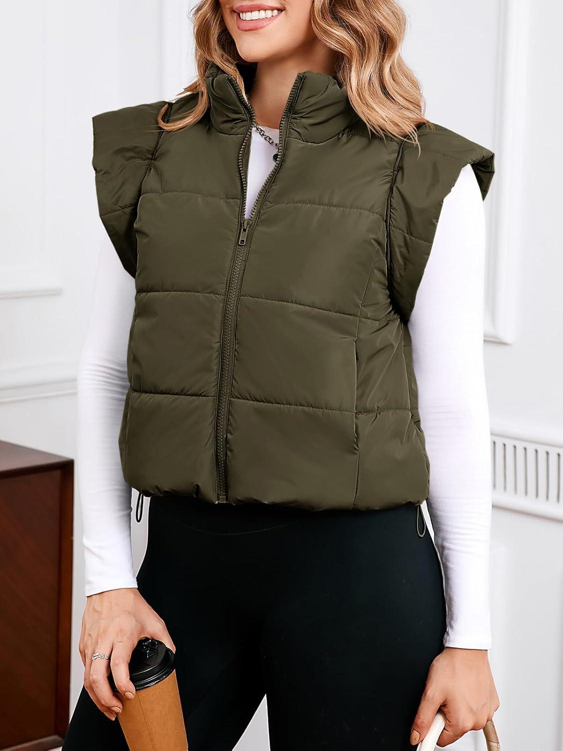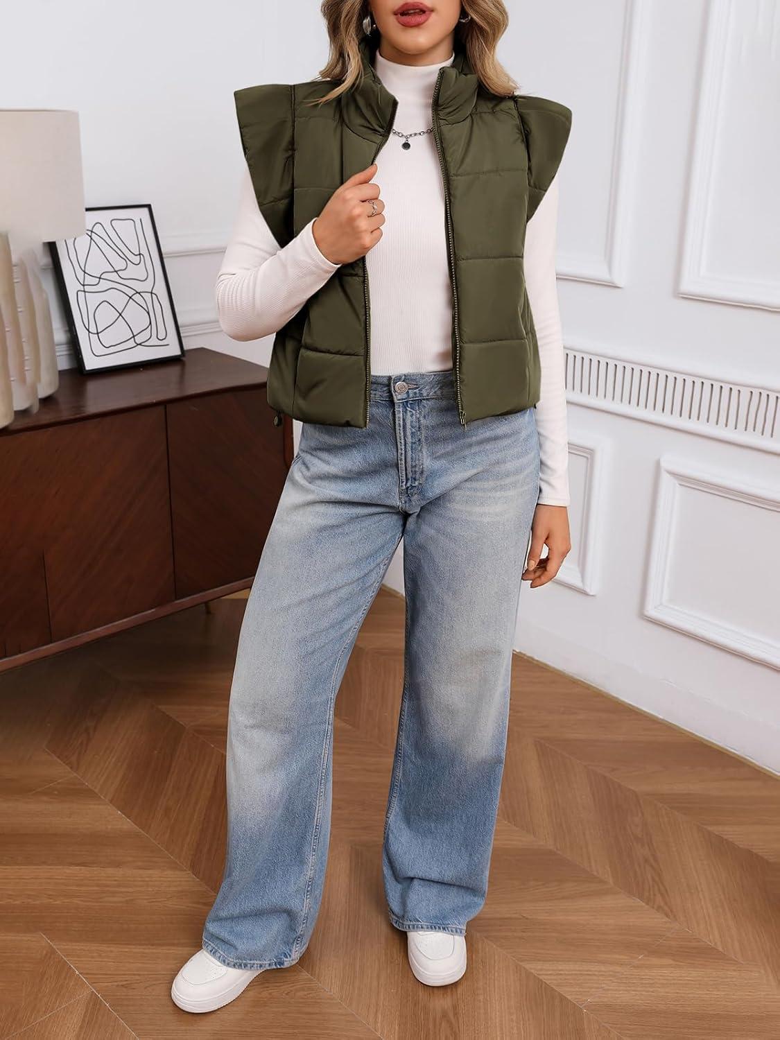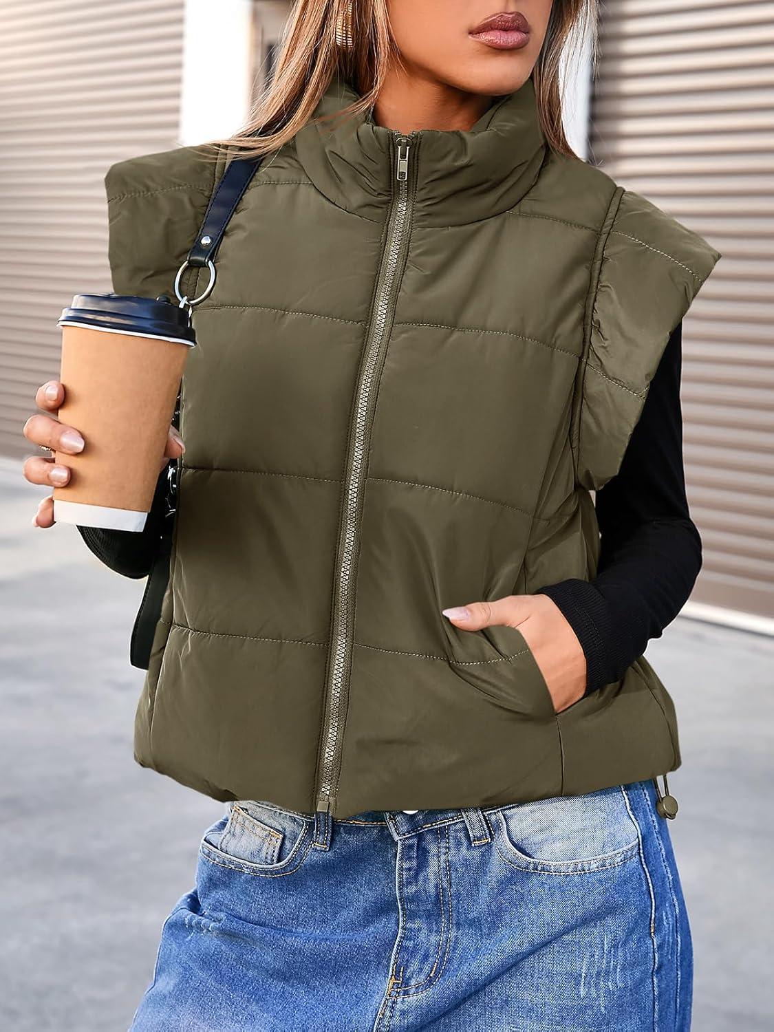 Tankaneo Womens Cropped Puffer Vest Cap Sleeve Zip Up Puffy Qulited Jacket Stand Collar Padded Gilet Coat Winter Outerwear(Army Green)
