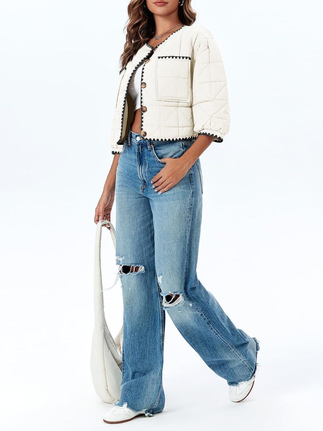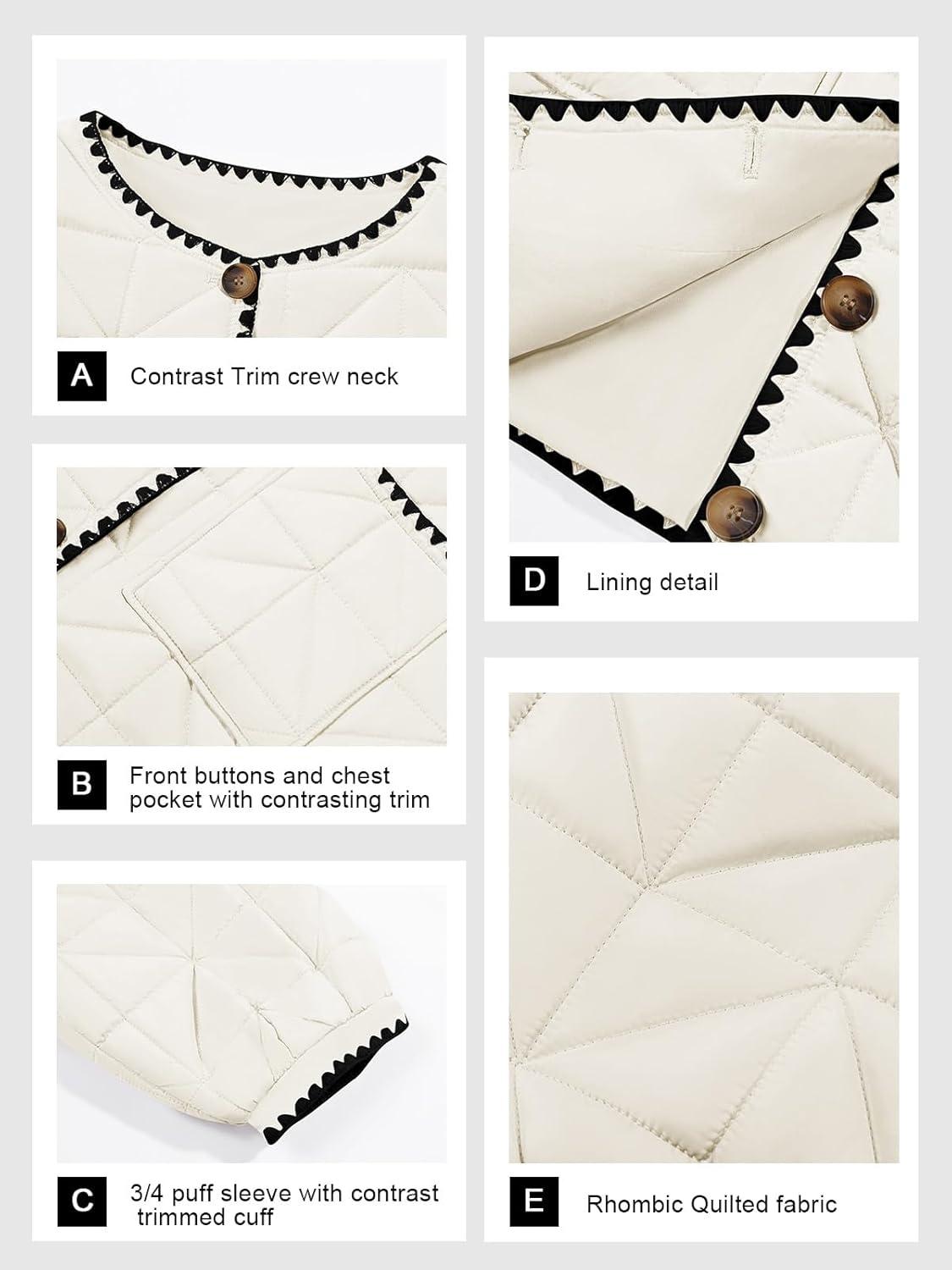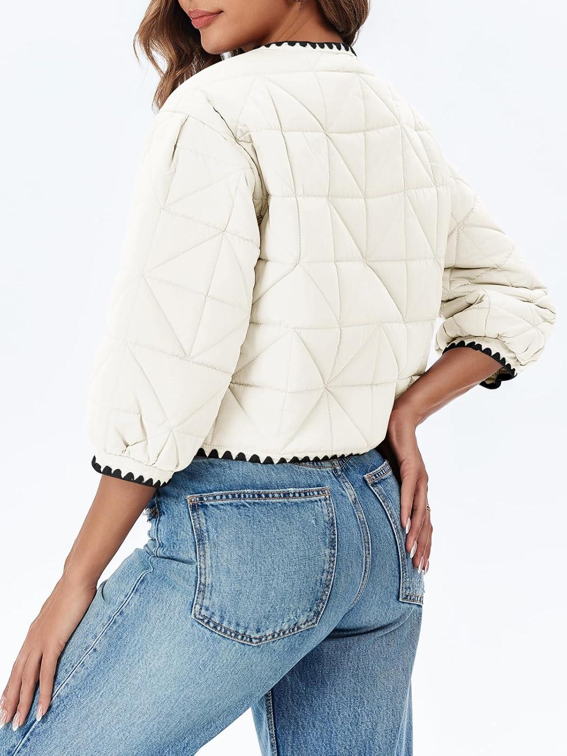 Tankaneo Womens Cropped Quilted Jacket Winter Lightweight Puff 3/4 Sleeve Button Down Contrast Trim Coat(Beige)