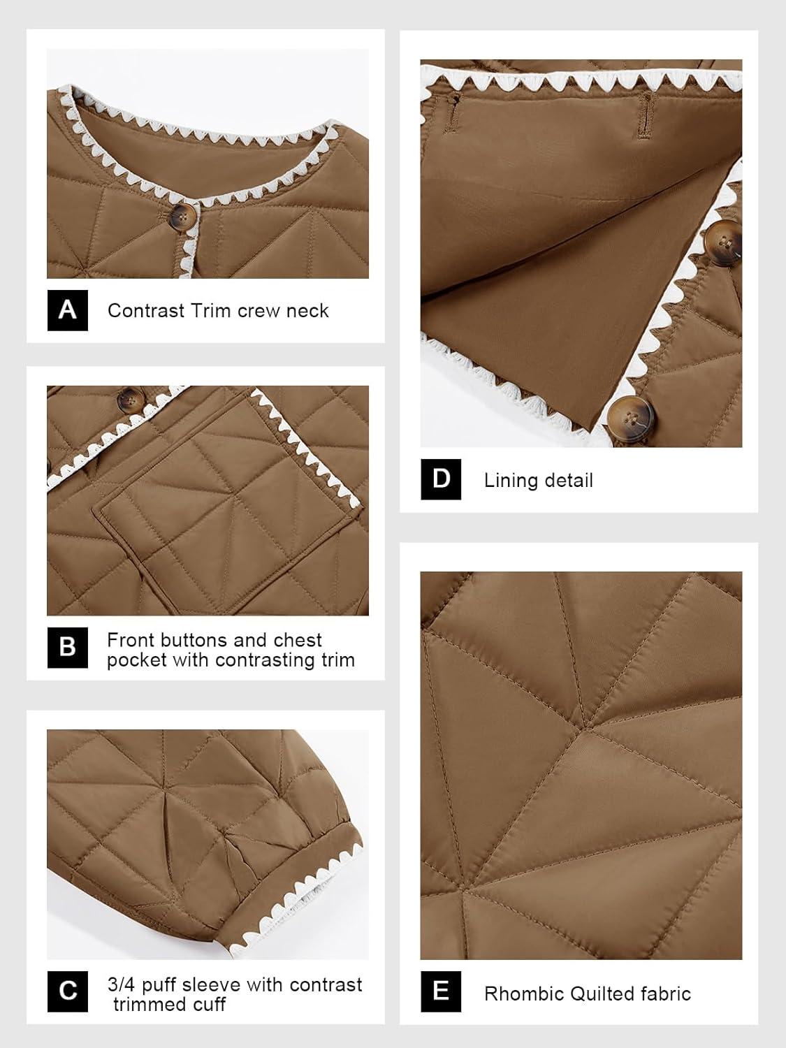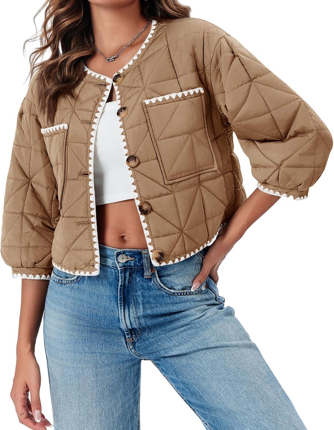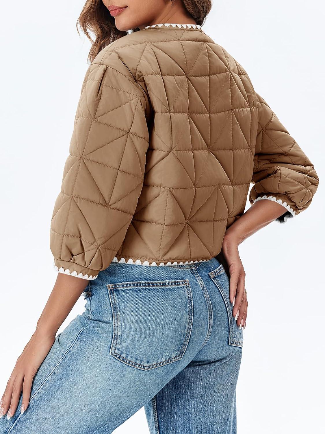 Tankaneo Womens Cropped Quilted Jacket Winter Lightweight Puff 3/4 Sleeve Button Down Contrast Trim Coat(Khaki)
