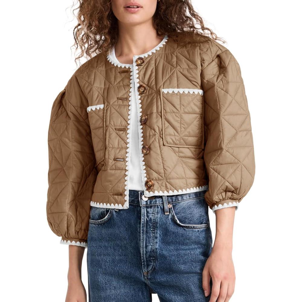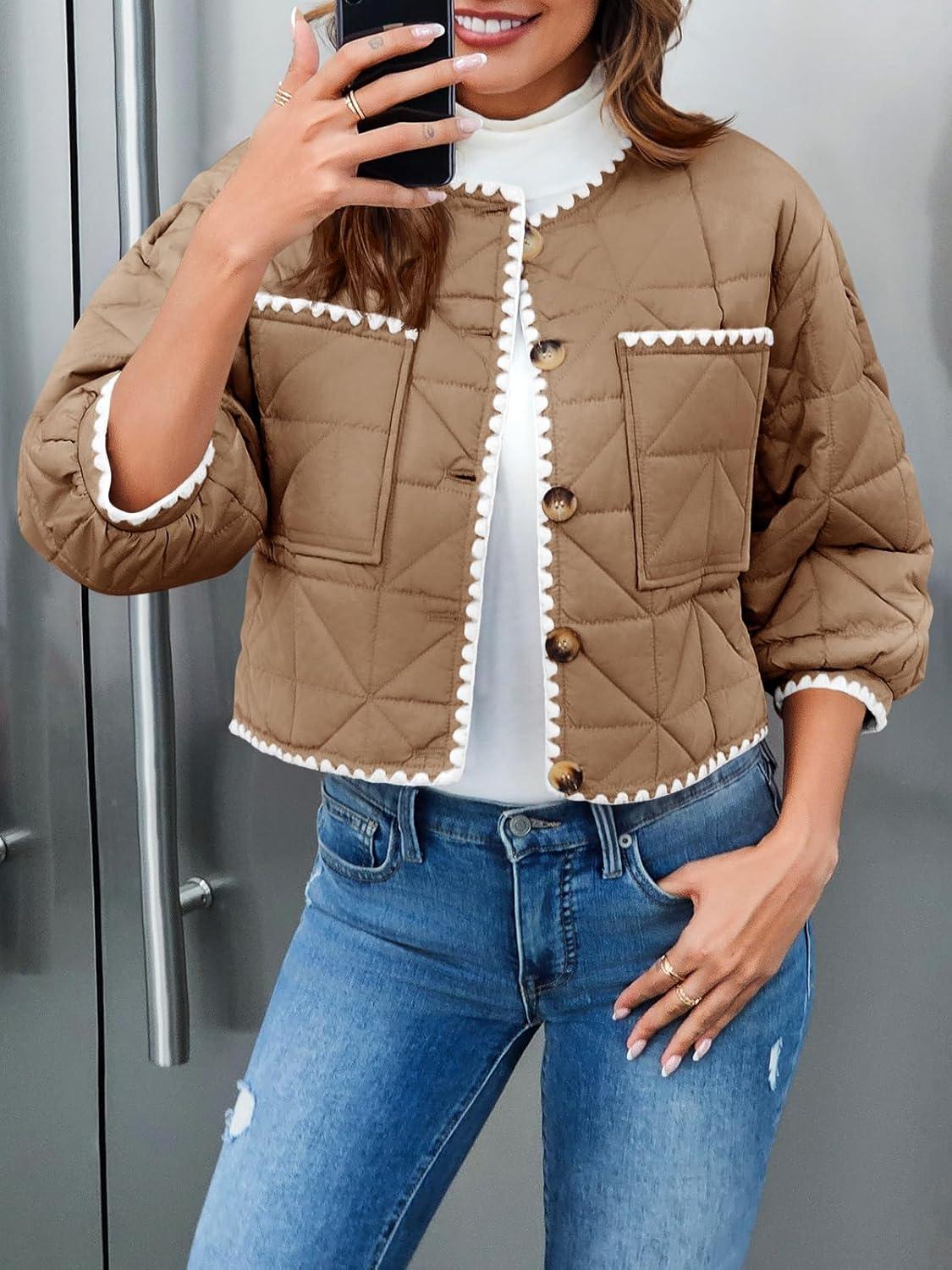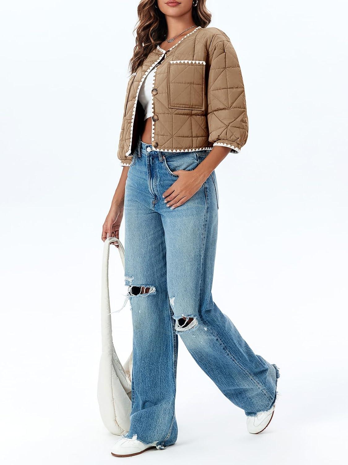 Tankaneo Womens Cropped Quilted Jacket Winter Lightweight Puff 3/4 Sleeve Button Down Contrast Trim Coat(Khaki)