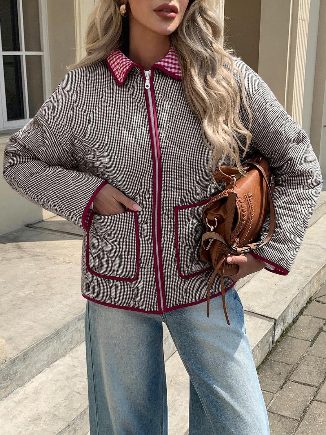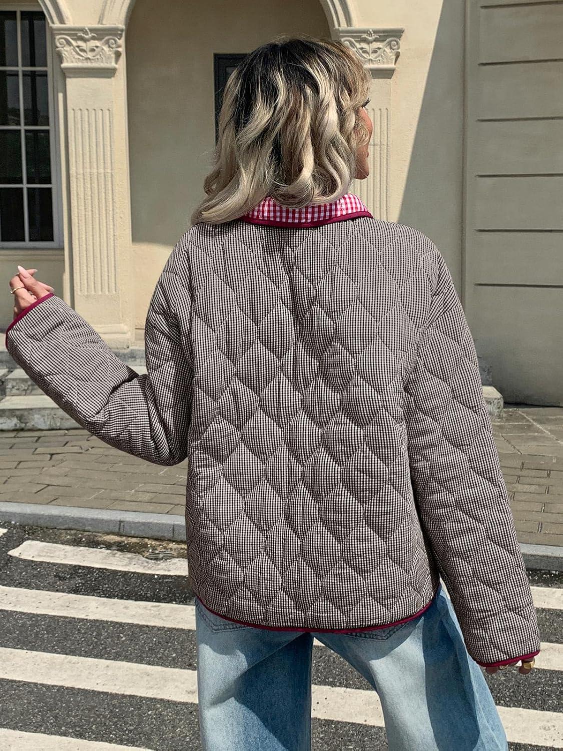 Tankaneo Womens Cropped Quilted Jackets Plaid Lightweight Full Zip Up Jacket Puffer Padded Coat with Pockets(Brown)