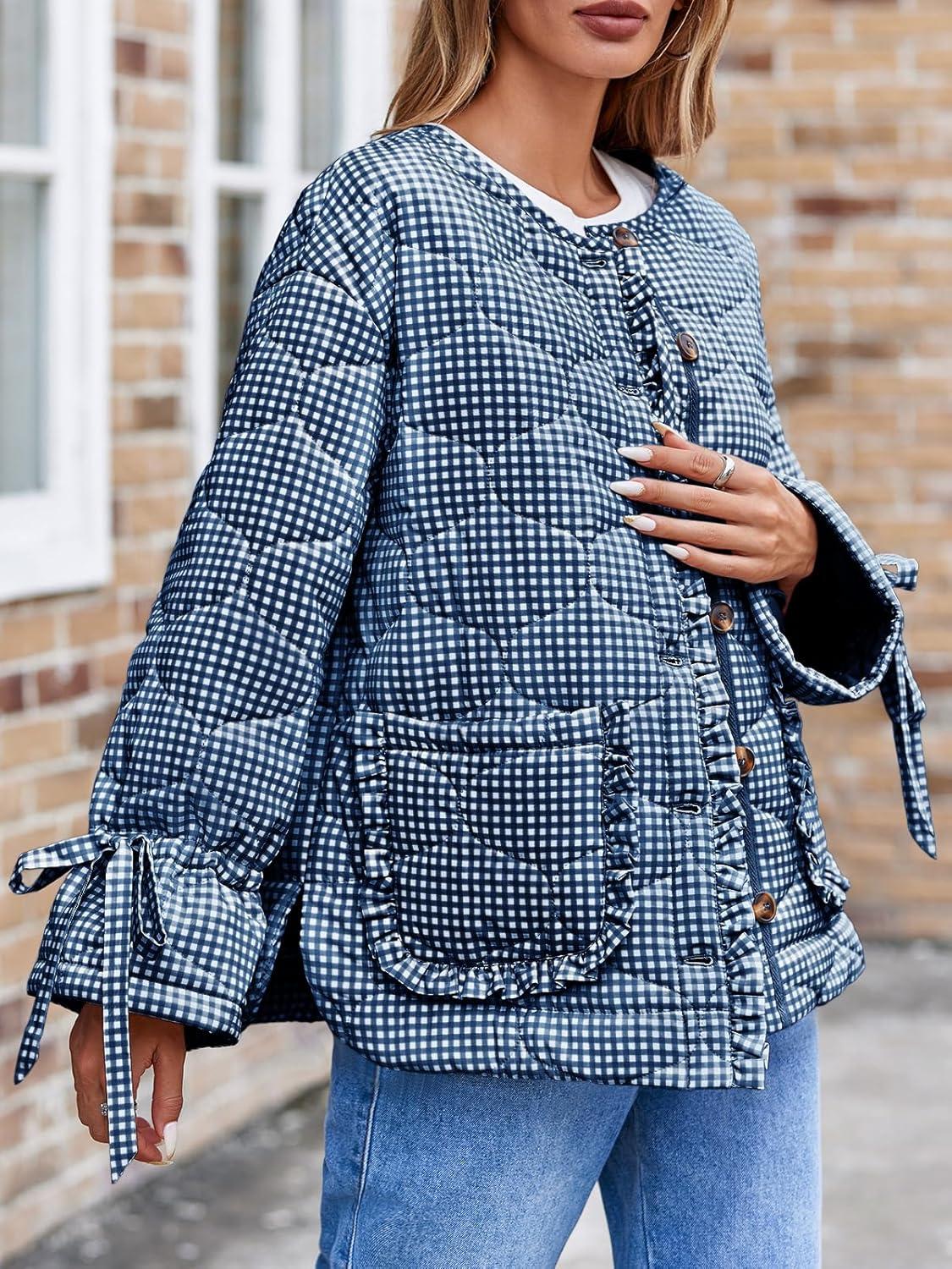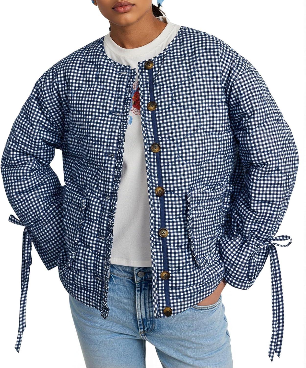 Tankaneo Womens Cropped Quilted Puffer Jackets Lightweight Plaid Button Down Bow Padded Down Coat(Navy)