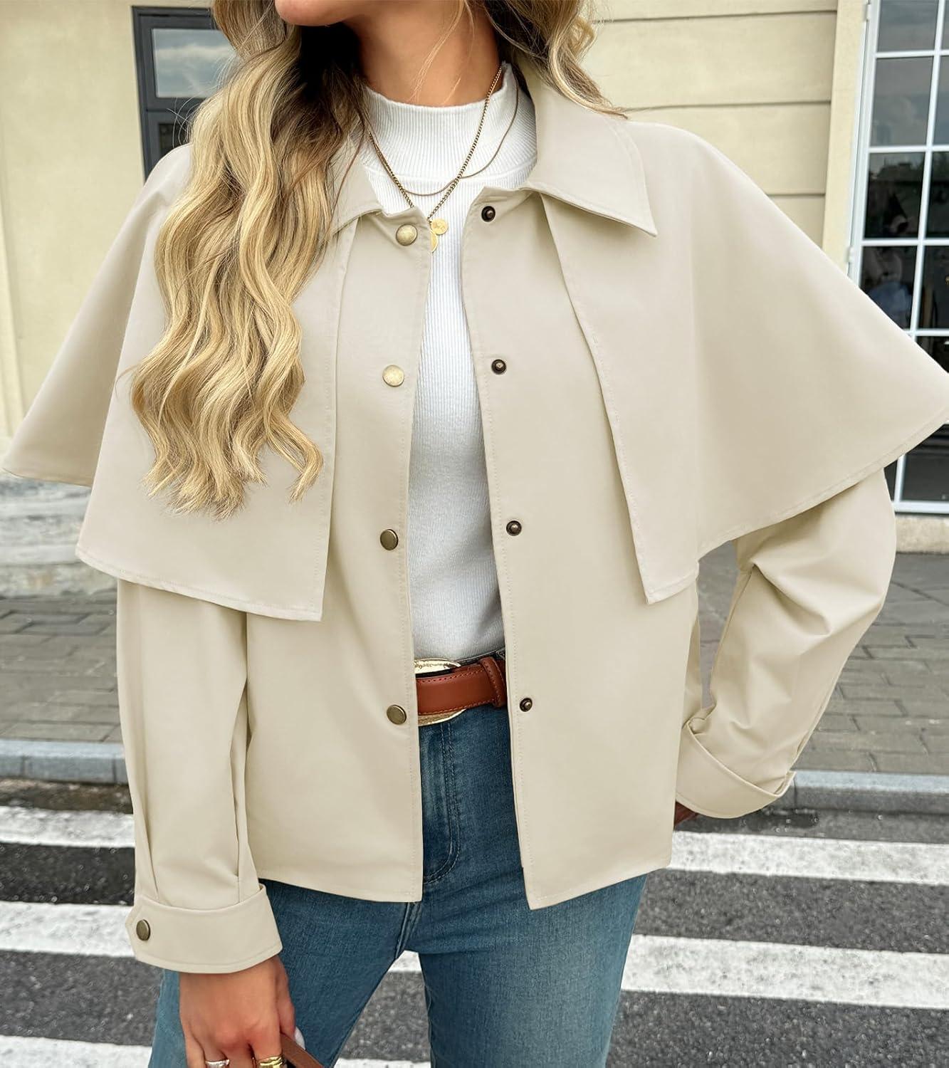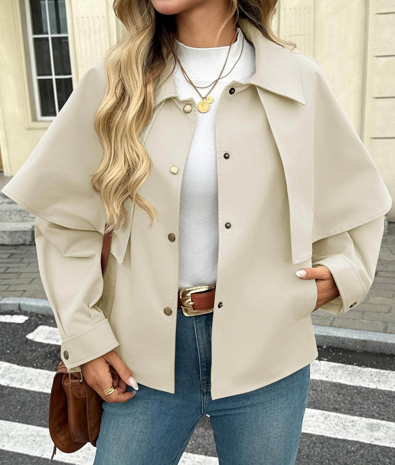 Tankaneo Womens Cropped Trench Coat Casual Lapel Single Breasted Cape Sleeve Short Jacket 2025 Fall Fashion Outerwear(Beige)