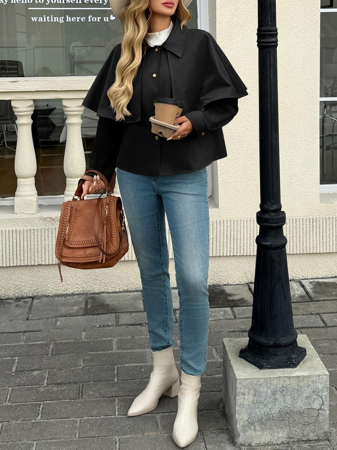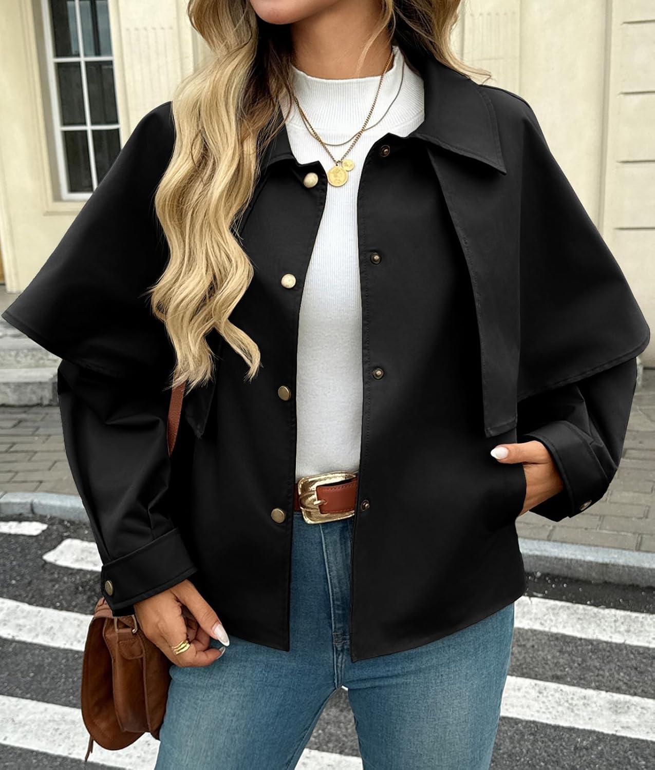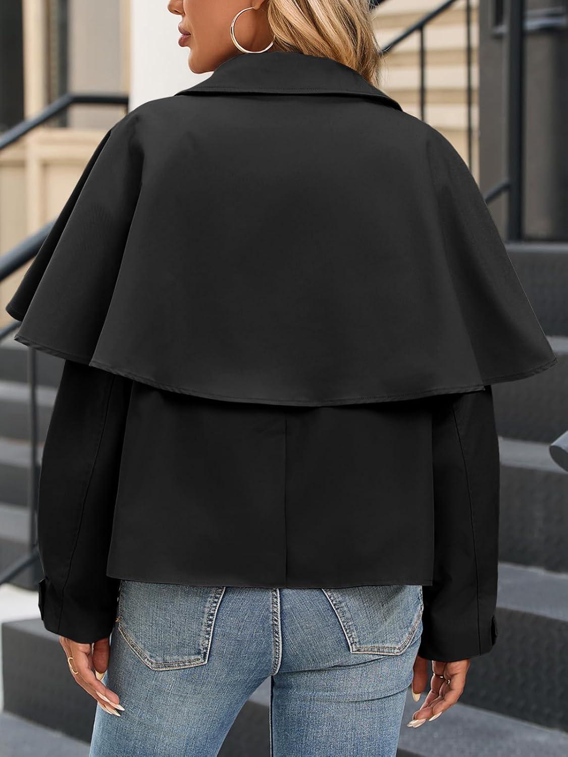 Tankaneo Womens Cropped Trench Coat Casual Lapel Single Breasted Cape Sleeve Short Jacket 2025 Fall Fashion Outerwear(Black)