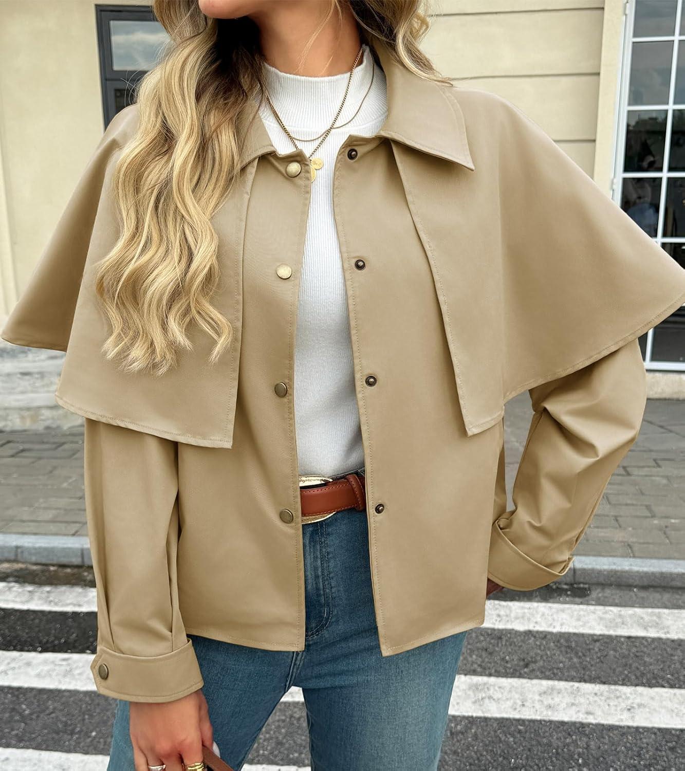 Tankaneo Womens Cropped Trench Coat Casual Lapel Single Breasted Cape Sleeve Short Jacket 2025 Fall Fashion Outerwear(Khaki)
