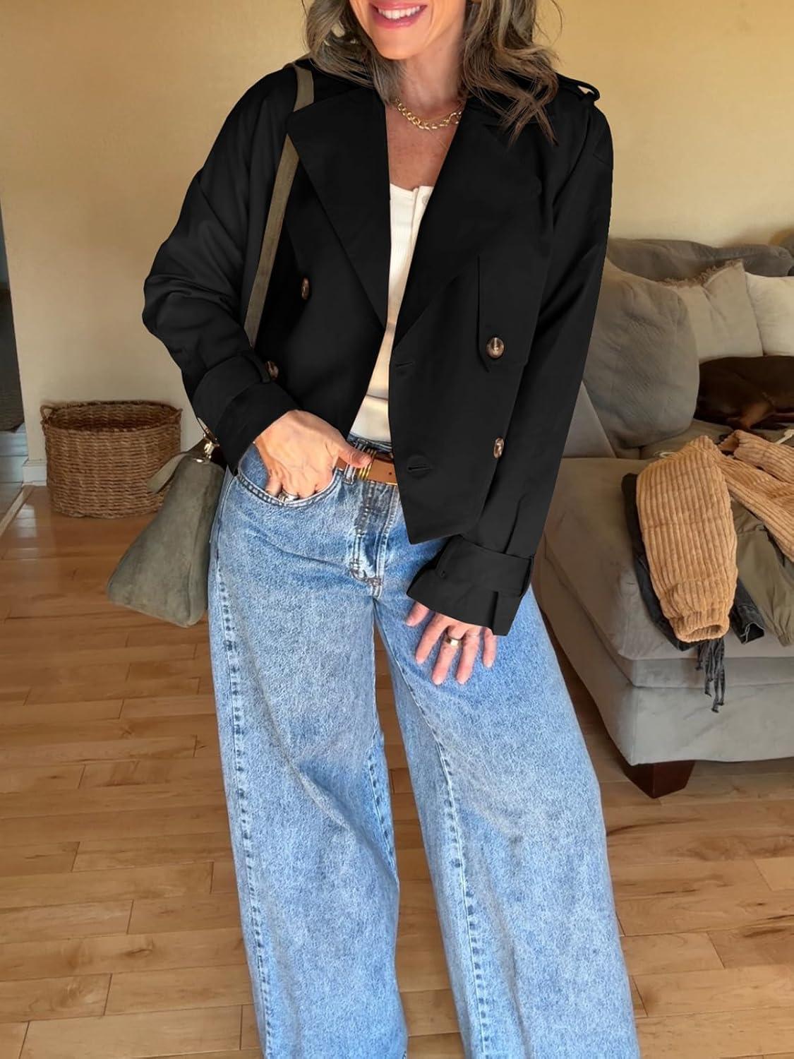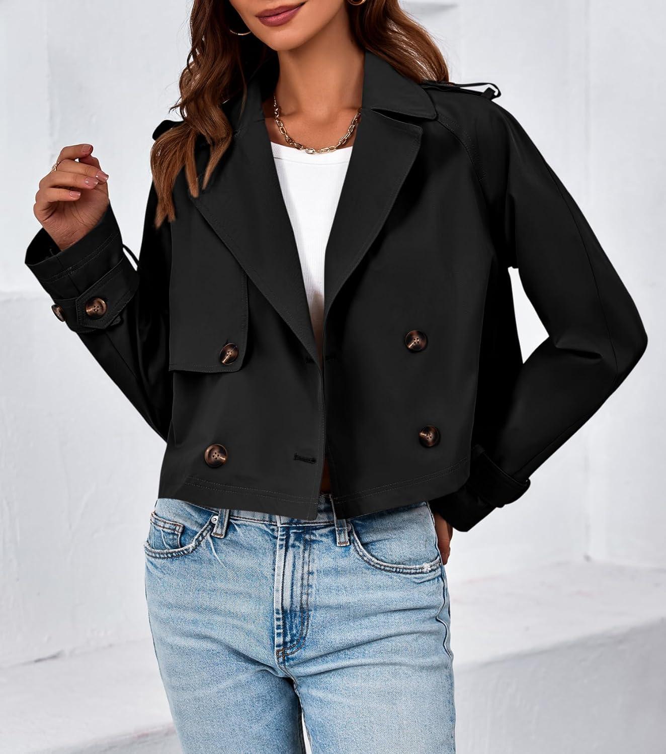 Tankaneo Womens Cropped Trench Coat Lapel Double Breasted Short Jacket Outwear(Black)