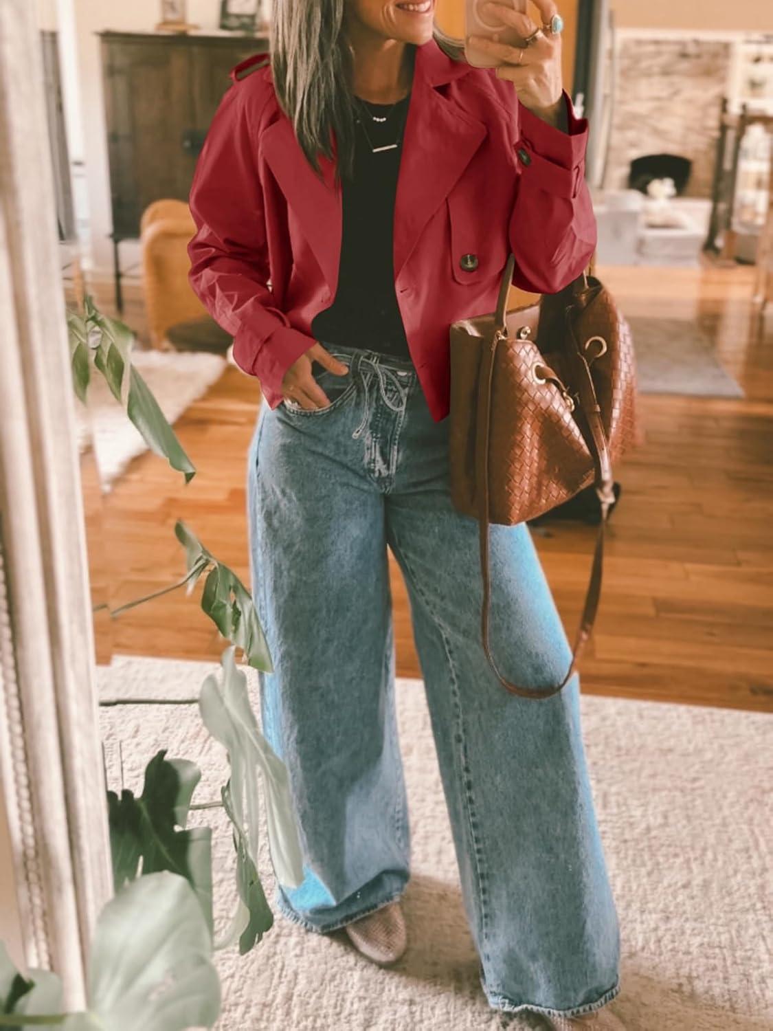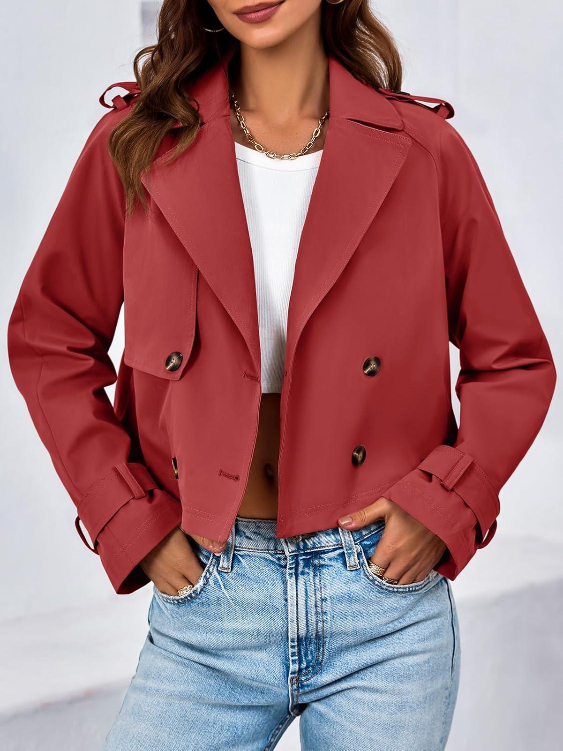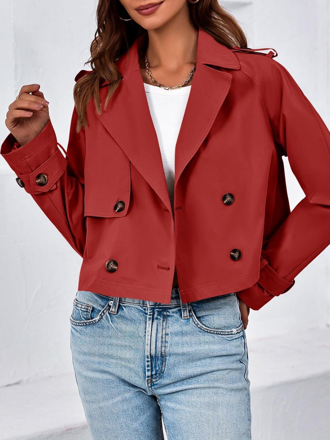 Tankaneo Womens Cropped Trench Coat Lapel Double Breasted Short Jacket Outwear(Red)