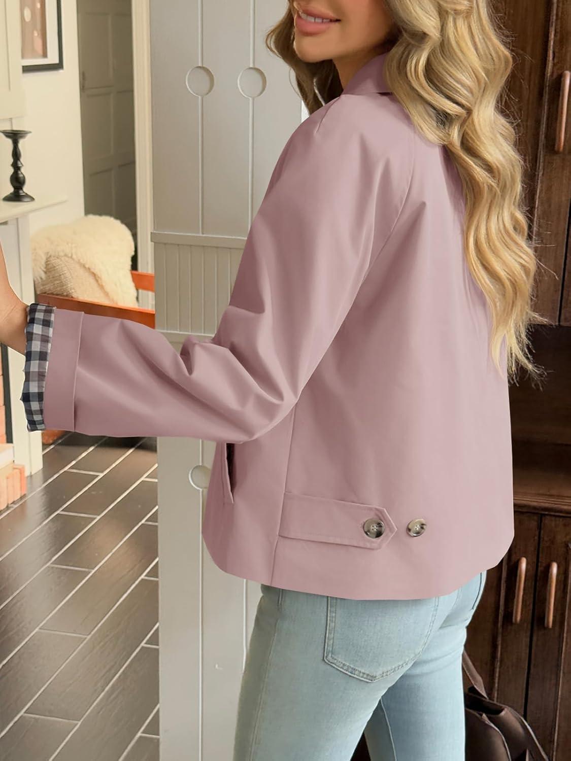 Tankaneo Womens Cropped Trench Coat Lightweight Single Breasted Jacket Fall Windbreaker Fashion Outerwear(Pink)
