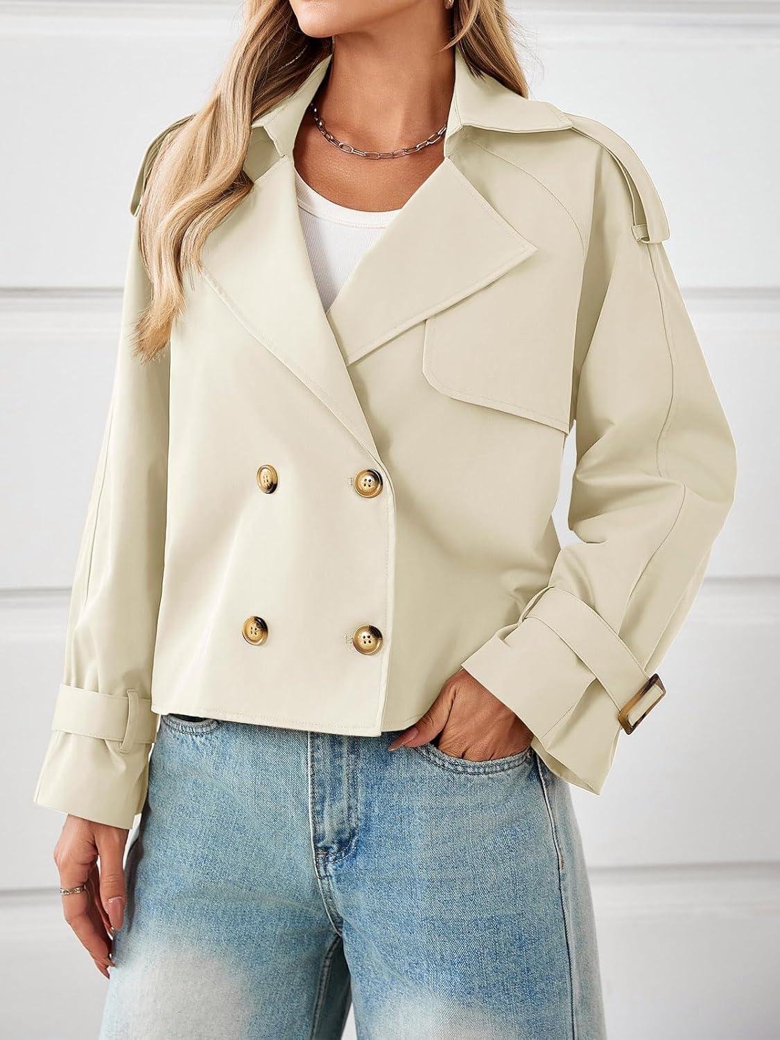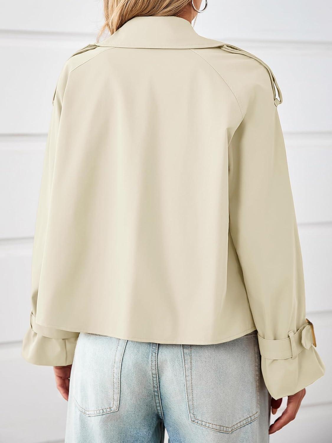 Tankaneo Womens Cropped Trench Coat Oversized Double Breasted Lapel Long Sleeve Short Jacket Fashion Outerwear(Beige)