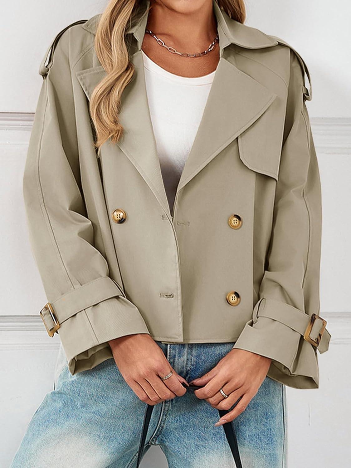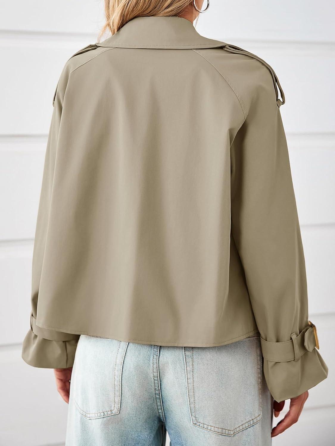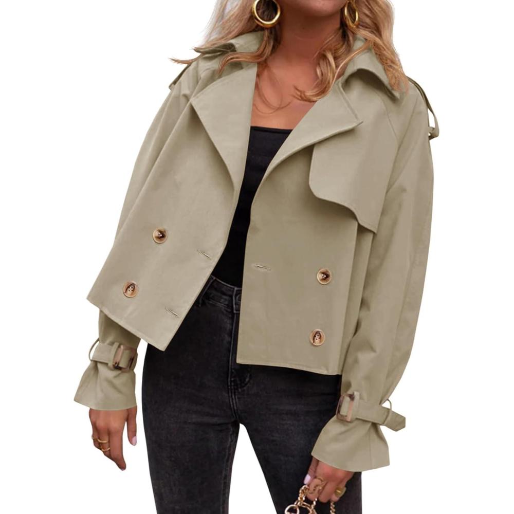 Tankaneo Womens Cropped Trench Coat Oversized Double Breasted Lapel Long Sleeve Short Jacket Fashion Outerwear(Light Khaki)