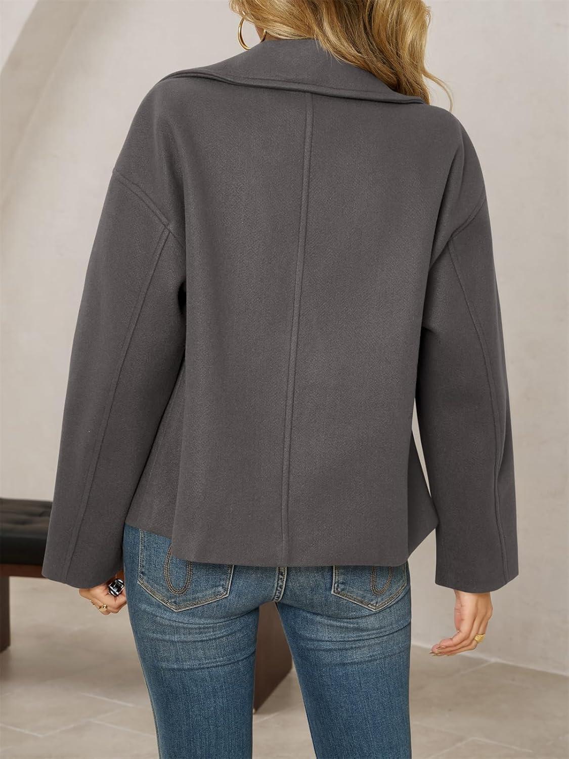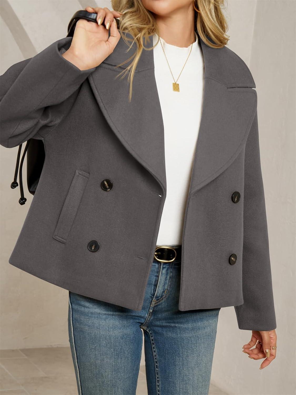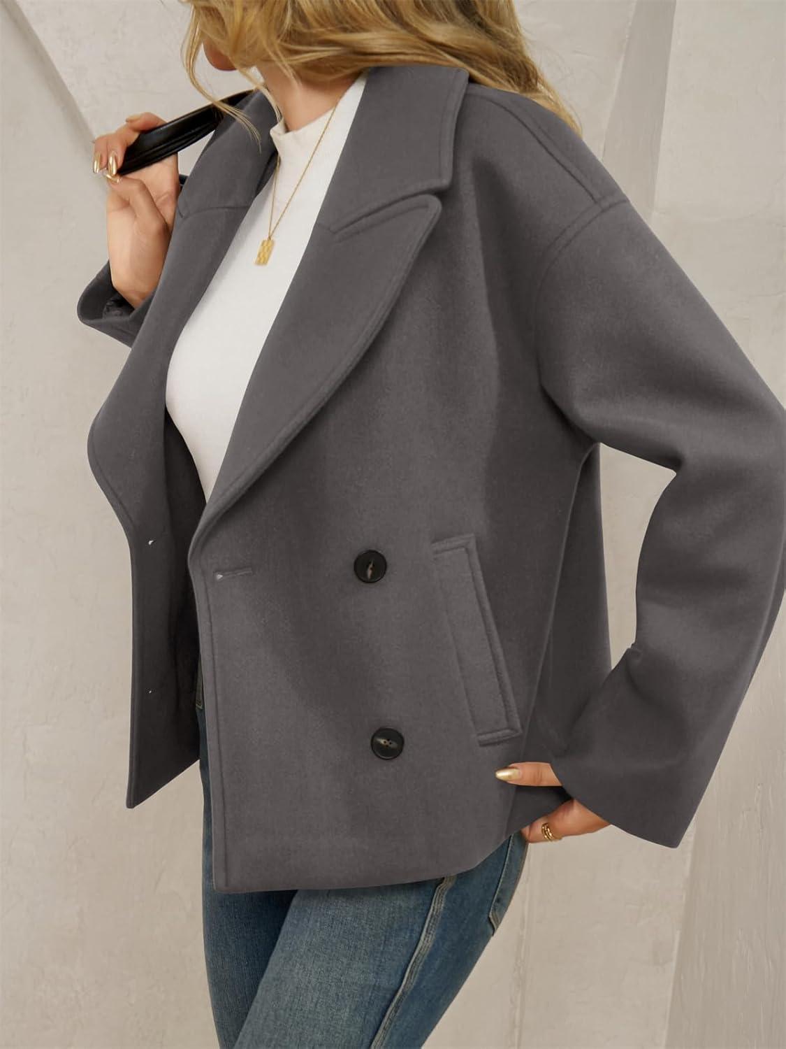 Tankaneo Womens Cropped Wool Blend Pea Coat Casual Long Sleeve Double Breasted Notched Lapel Overcoat Jackets(Dark Grey)