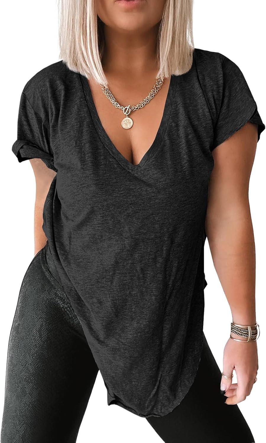 Tankaneo Womens Deep V Neck Short Sleeve T Shirts Side Slit Oversized Summer Loose Tunic Top(Black)