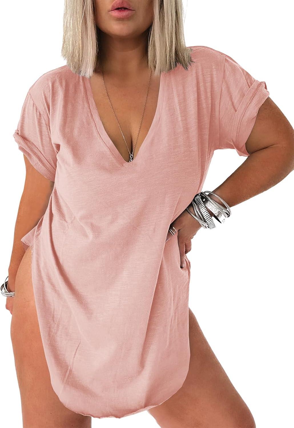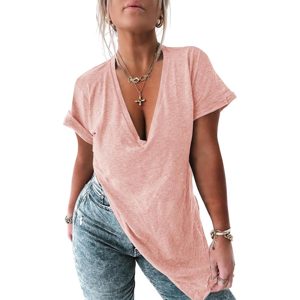 Tankaneo Womens Deep V Neck Short Sleeve T Shirts Side Slit Oversized Summer Loose Tunic Top(Pink)