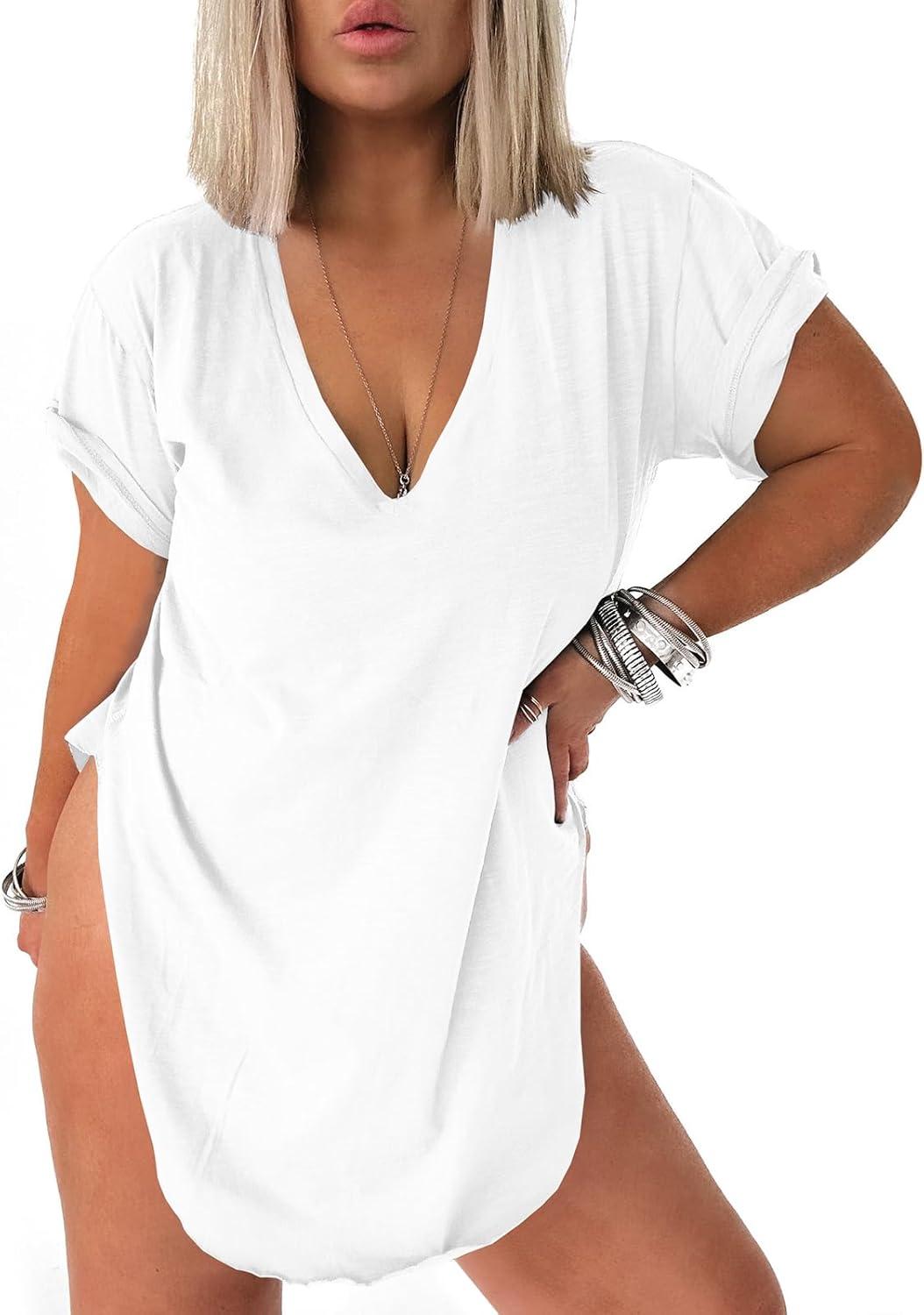 Tankaneo Womens Deep V Neck Short Sleeve T Shirts Side Slit Oversized Summer Loose Tunic Top(White)