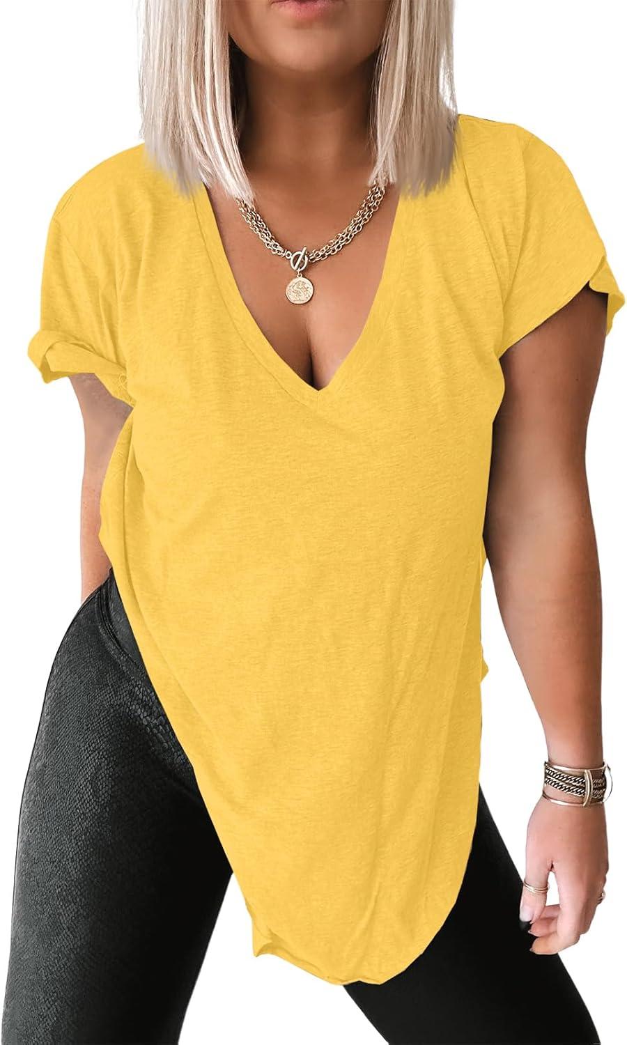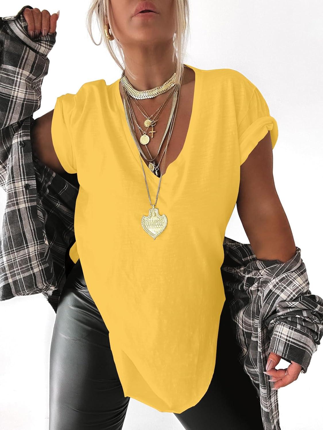 Tankaneo Womens Deep V Neck Short Sleeve T Shirts Side Slit Oversized Summer Loose Tunic Top(Yellow)