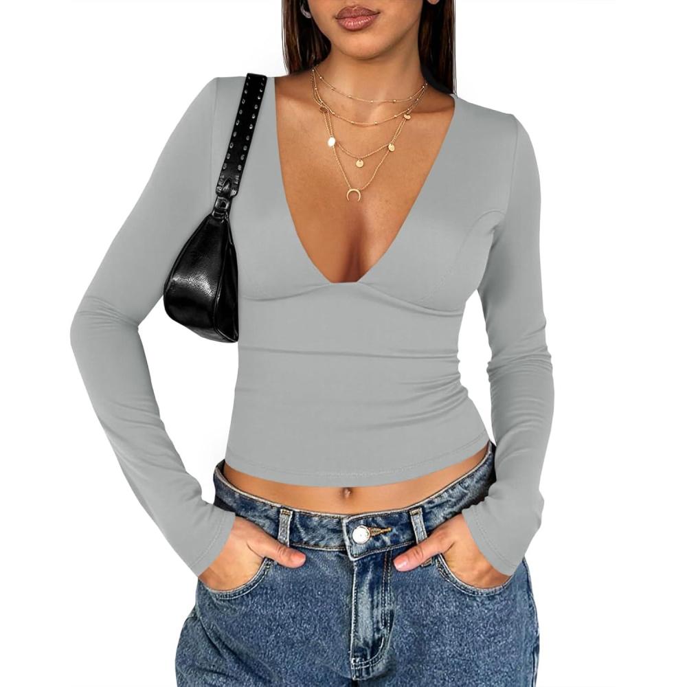 Tankaneo Women’s Deep V Neck T Shirts Sexy Long Sleeve Casual Going Out Cropped Tops Slim Fitted Y2K Outfits(Grey)