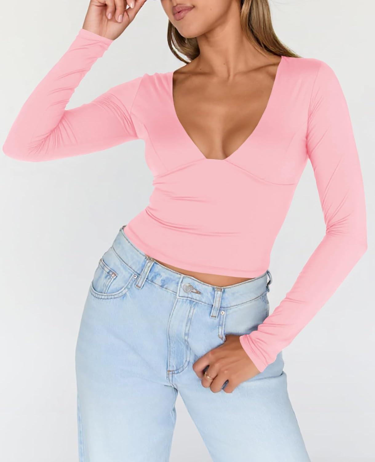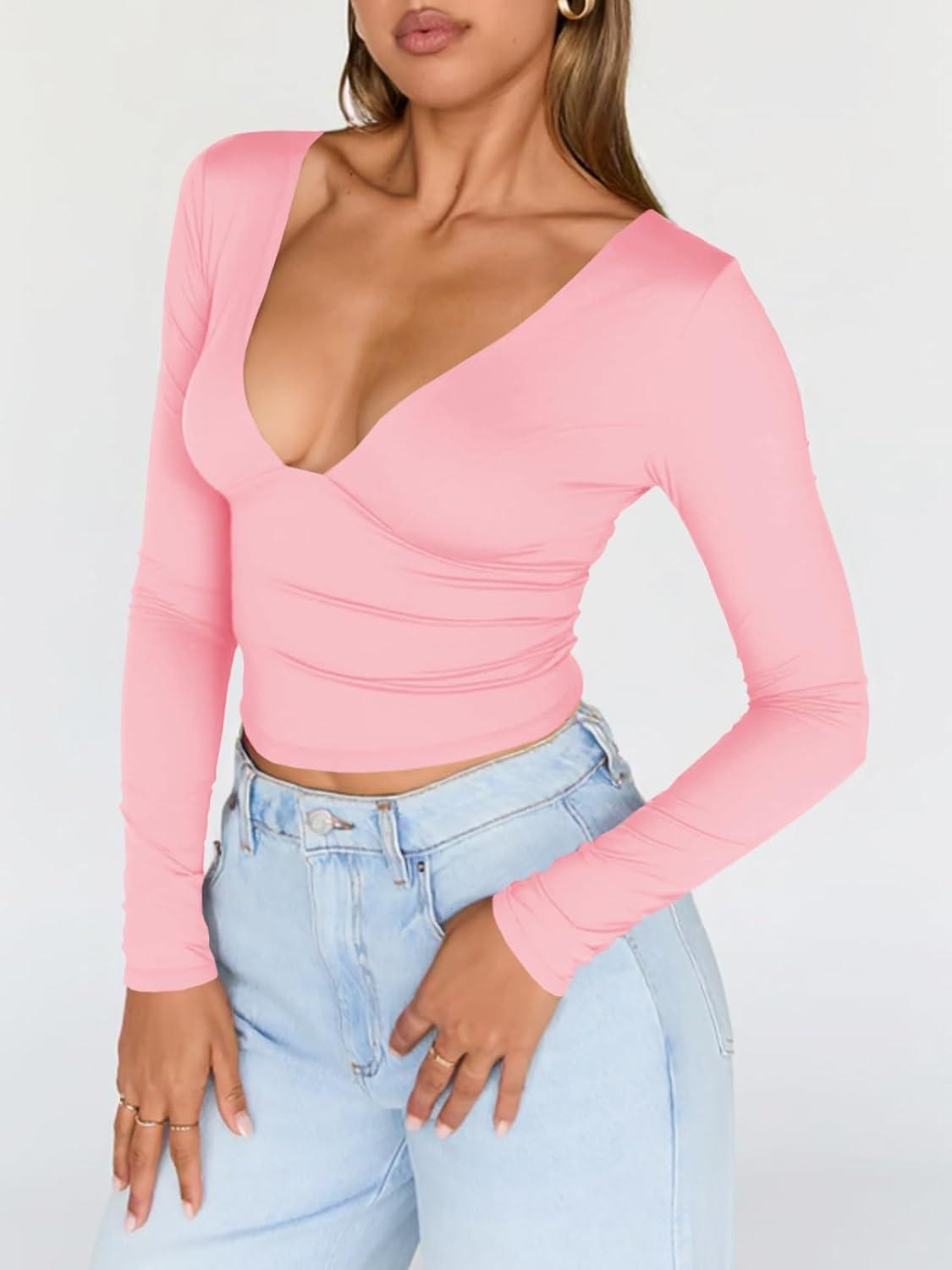 Tankaneo Women’s Deep V Neck T Shirts Sexy Long Sleeve Casual Going Out Cropped Tops Slim Fitted Y2K Outfits(Pink)