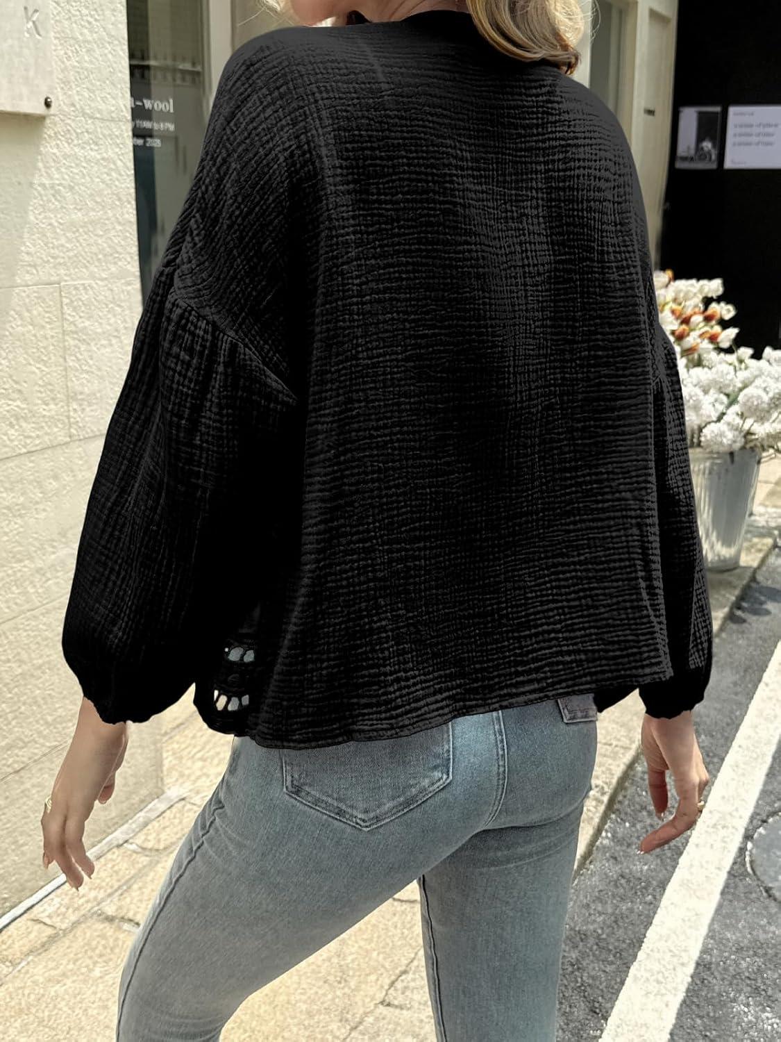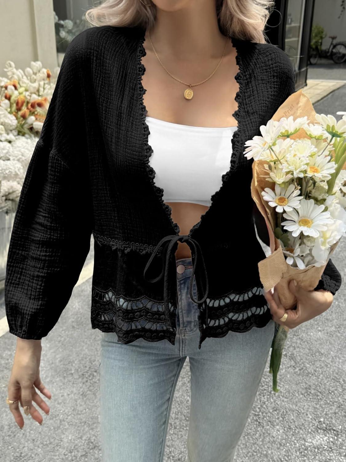 Tankaneo Womens Deep V Neck Tie Front Blouse Cotton Long Puff Sleeve Eyelet Tops Cute Lace Trim Flowy Ruffle Shirts(Black)