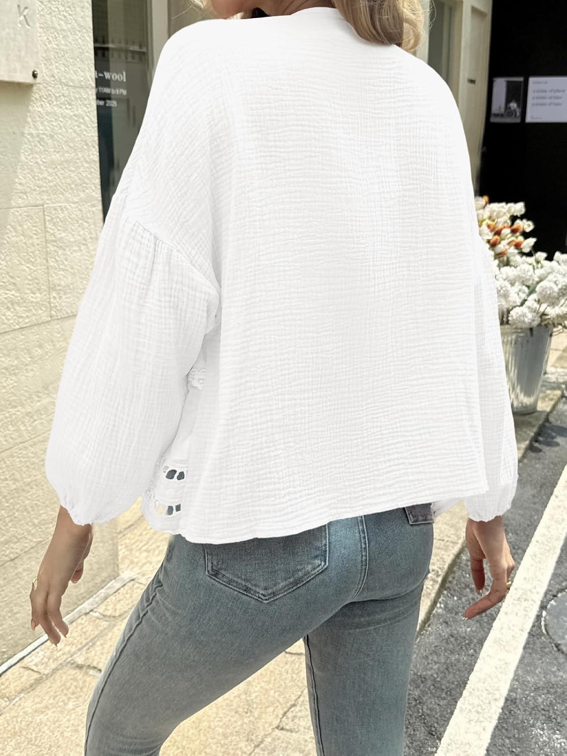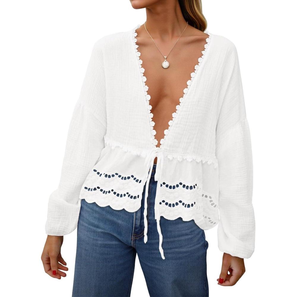 Tankaneo Womens Deep V Neck Tie Front Blouse Cotton Long Puff Sleeve Eyelet Tops Cute Lace Trim Flowy Ruffle Shirts(White)