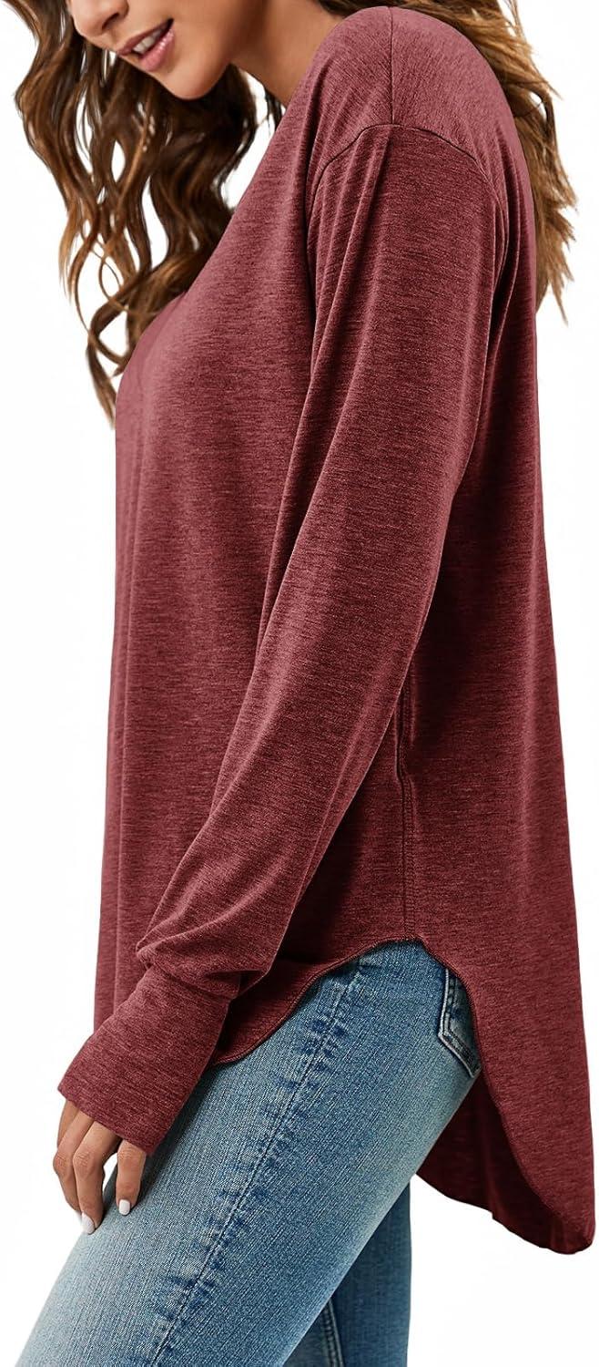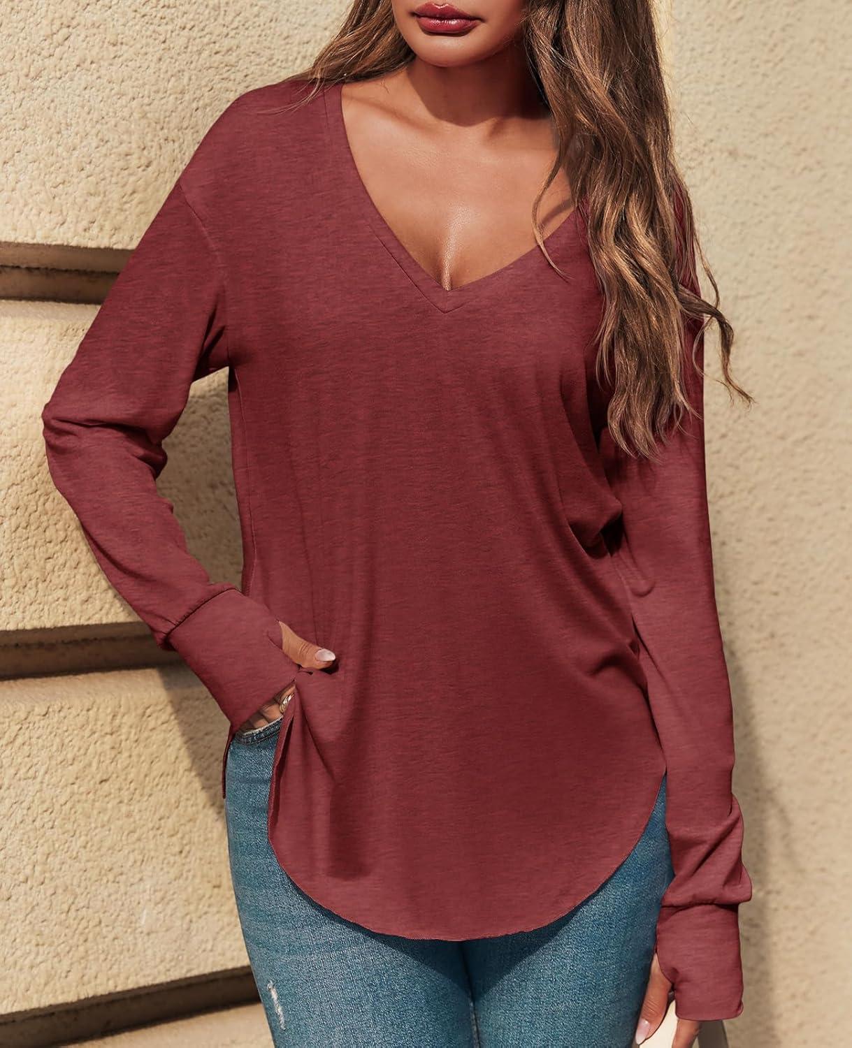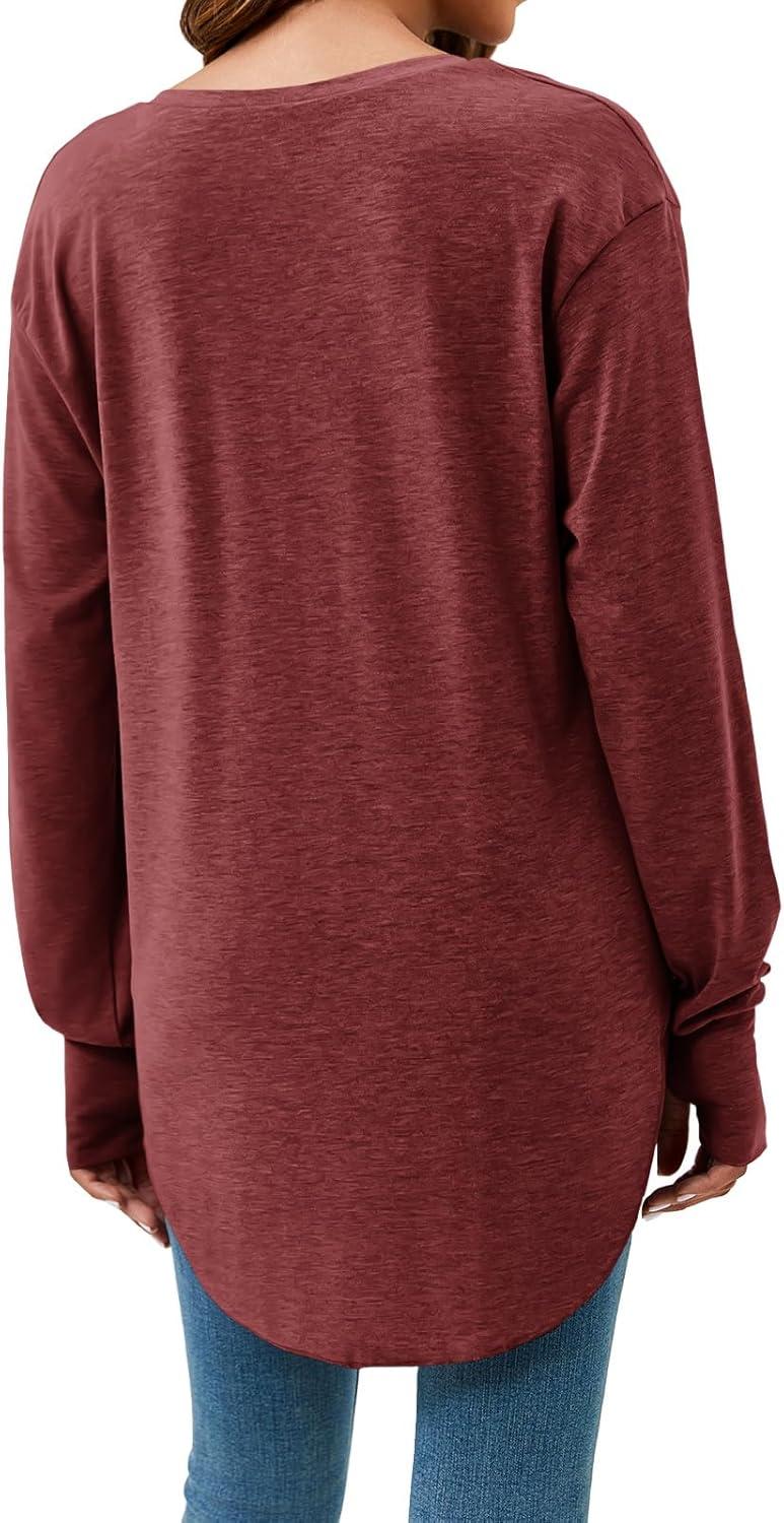 Tankaneo Womens Deep V Neck Tunic Tops Long Sleeve Oversized Casual Loose Fit Curved Hem T Shirts(Burgundy)
